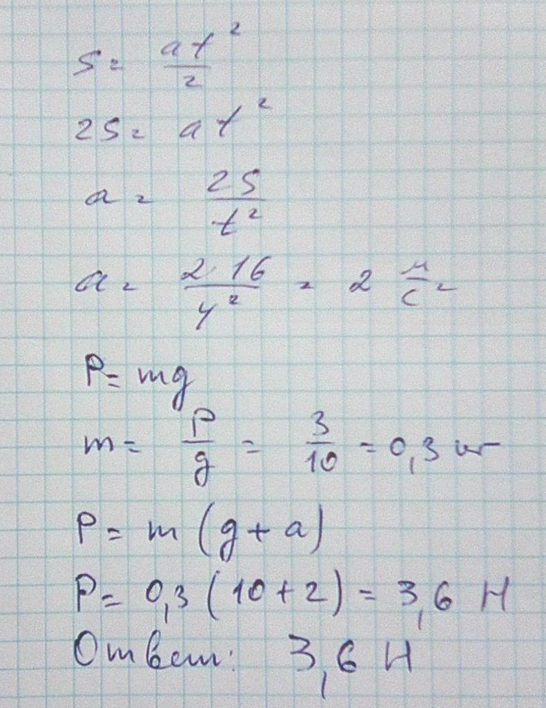 Вес покоящегося на земле тела равен 3H.Какими будут показания пружинных весов в кабине равноускоренно поднимающегося лифта, если лифт за 4 сек поднялся на высоту 16м?