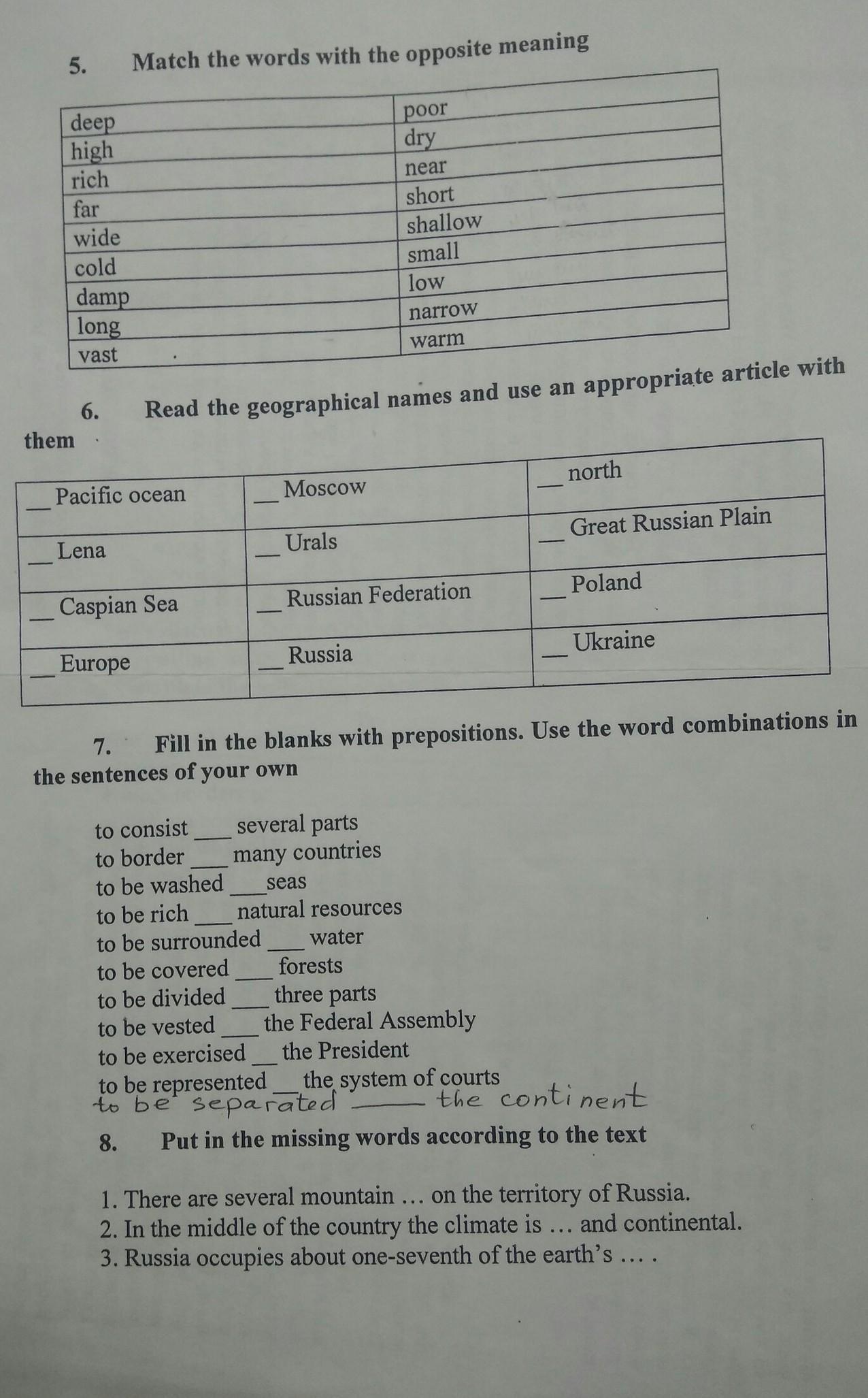 6. The Pacific ocean, Moscow, the north, Lena, the Urals, the Great Russian plain, the Caspian Sea, the Russian Federation, Poland, Europe, Russia, Ukraine