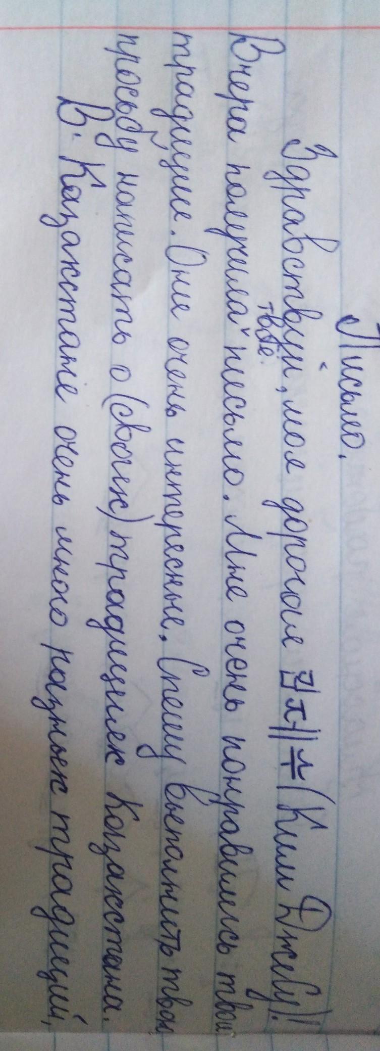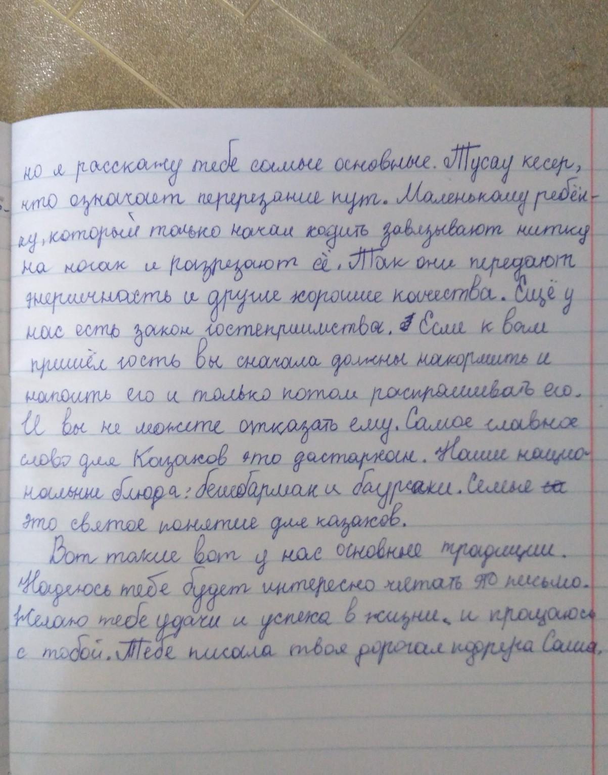 Привет мой дорогой друг. хочу рассказать тебе о своей родине Казахстан. У казахов есть много традиций. например тусаукесер разрезание путов, Кыз ату это во время свадьбы. В Казахстане очень много разных традиций и собственных праздников такие как Наурыз. Казахи очень дружелюбный народ. Я жду тебя в гости в наш родной Казахстан