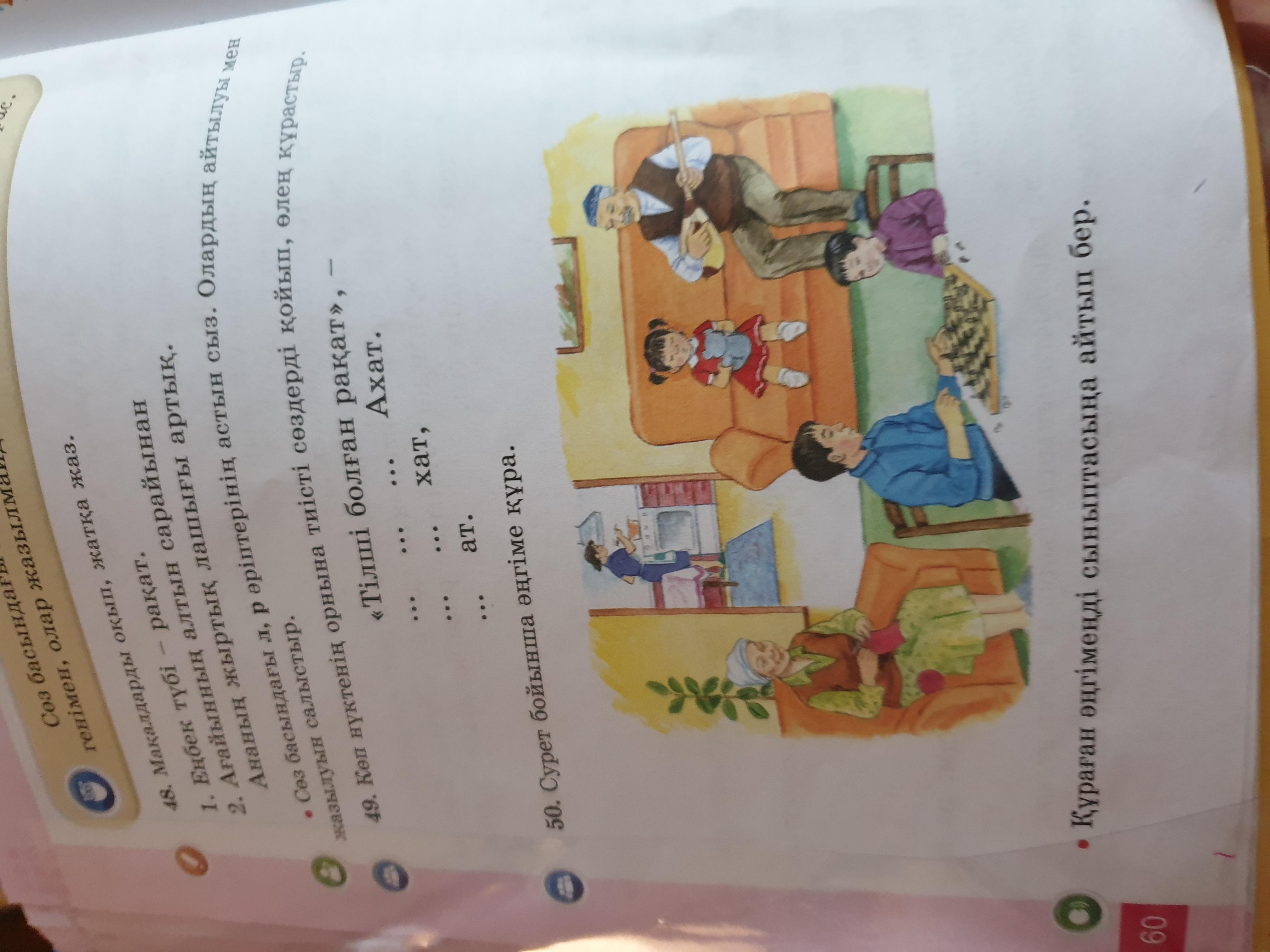 Мен досымен шахмат ойнап отырмын. Анам тамак бисирип жатыр. Атам домбыра ойнап отыр. Карындасым ойнап отыр.Ал ажем токып отыр
