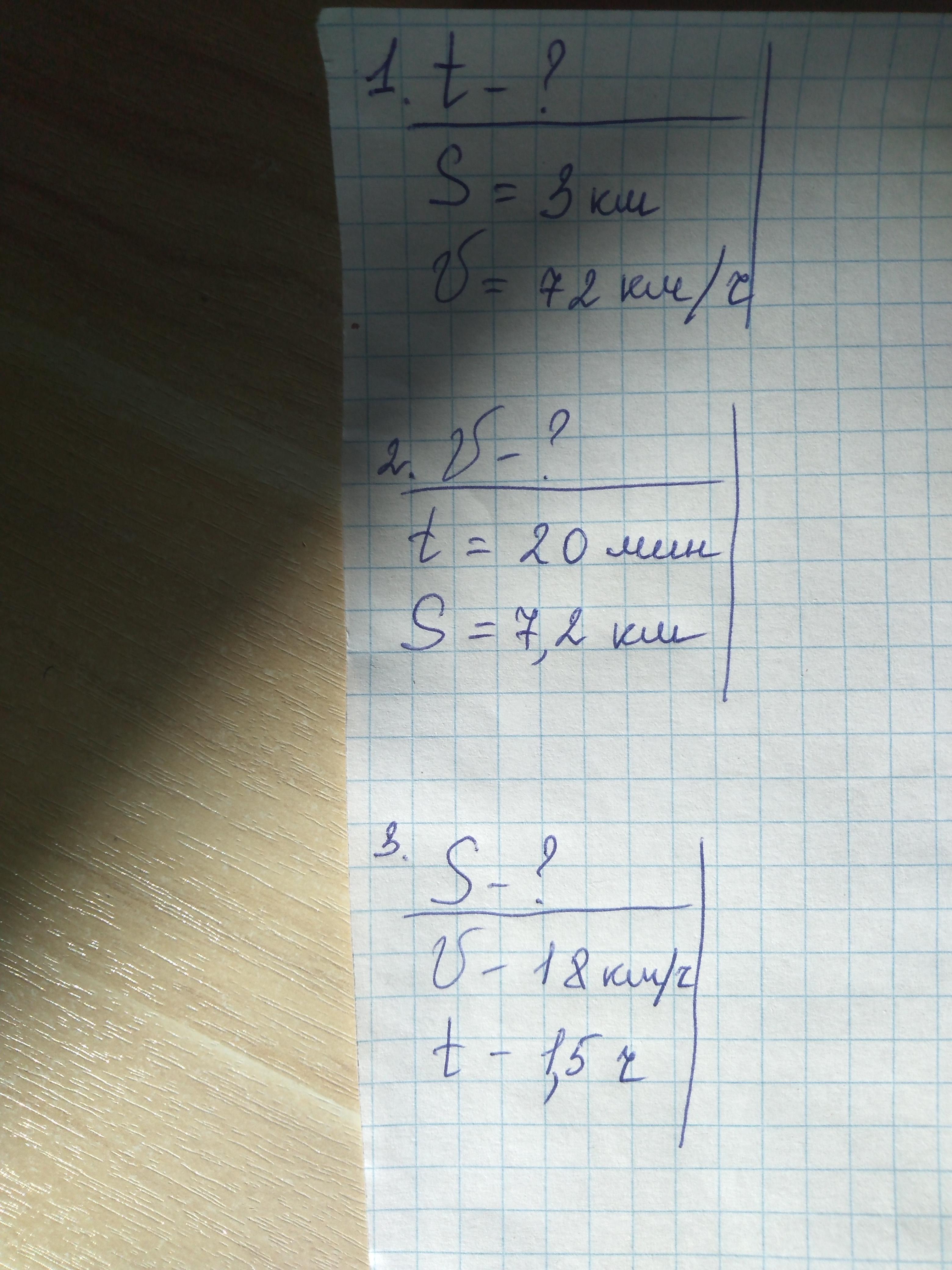 1. t=s/v=3/72=1/24ч