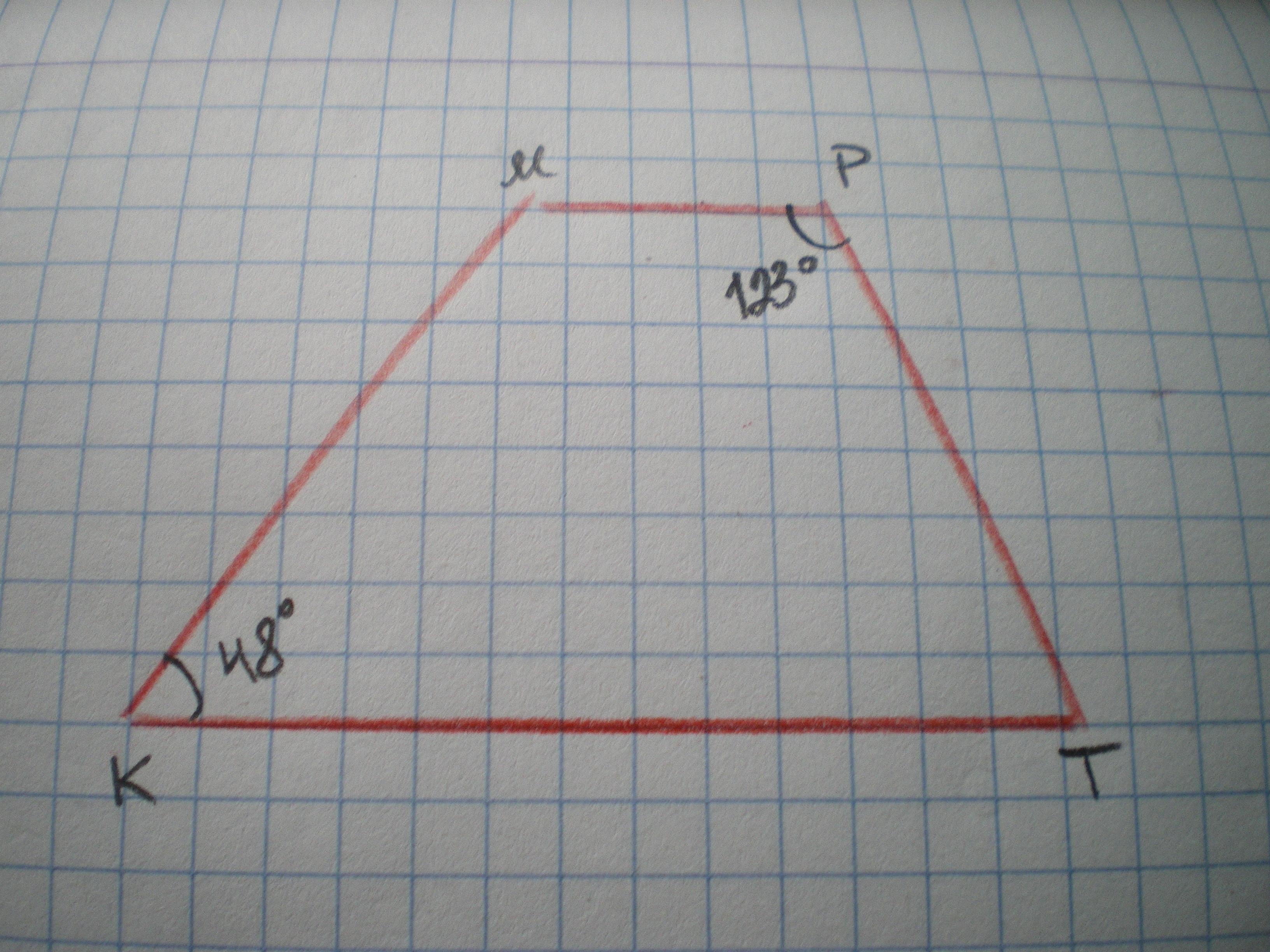 Дано: КМРТ - трапеція, ∠K=48°, ∠Р=123°. Знайти ∠М, ∠Т.