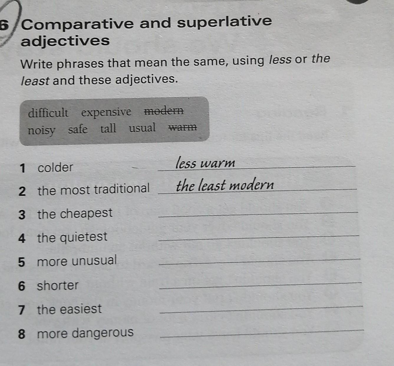 В то же время, the most traditional, the cheapest, quietest, easiest - все имеют форму MOST или EST в конце, и это показывает, что что-то САМОЕ необычное, традиционное, тихое и т.д. Тогда в противоположность the MOST(наибольшее) мы используем the LEAST(наименьшее). Например, the most traditional (самое традиционное) становится the least modern (наименее современное), the cheapest (самое дешевое) - the least expensive (наименее дорогое) и так далее.