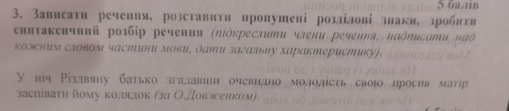 записати речення, розставити пропущені розділові знаки, зробити синтаксичний розбір речення (підкреслити члени речення, надписати над кожним словом частину мови, дати загальну характеристику) .