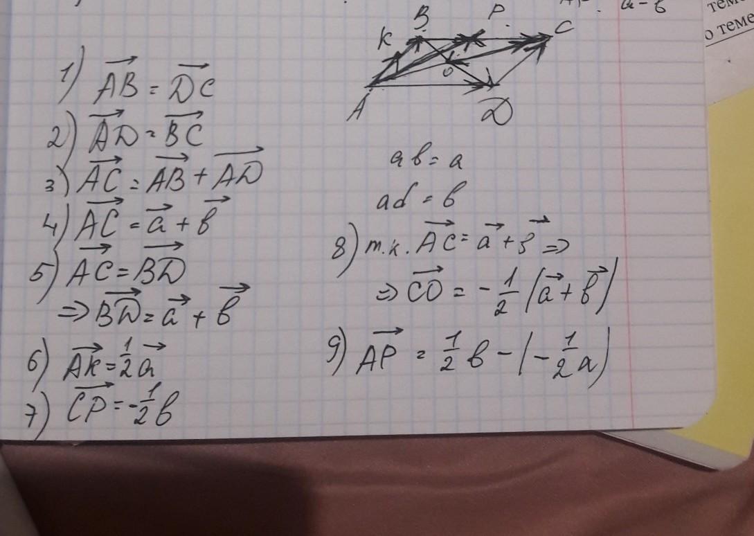 В параллелограмме abcd точка k середина ab точка p сердима bc выразите векторы ac bd ak cp co ap через векторы ab=a ad=b