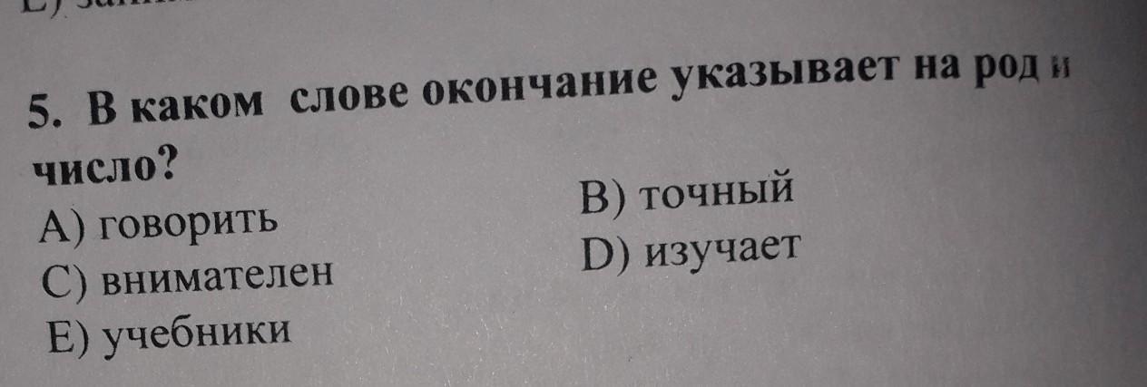 Объяснение: Проверяем 1 слово "говорить". говорить-род не узнать, так что уже нет. 2 слово "внимателен" внимателен- род мужской, число- ед ч, значит нет. 3) Учебники-род не определяется значит нет. 4) точный-род мужской число ед ч 5)изучает нет, так как число не определяемое.