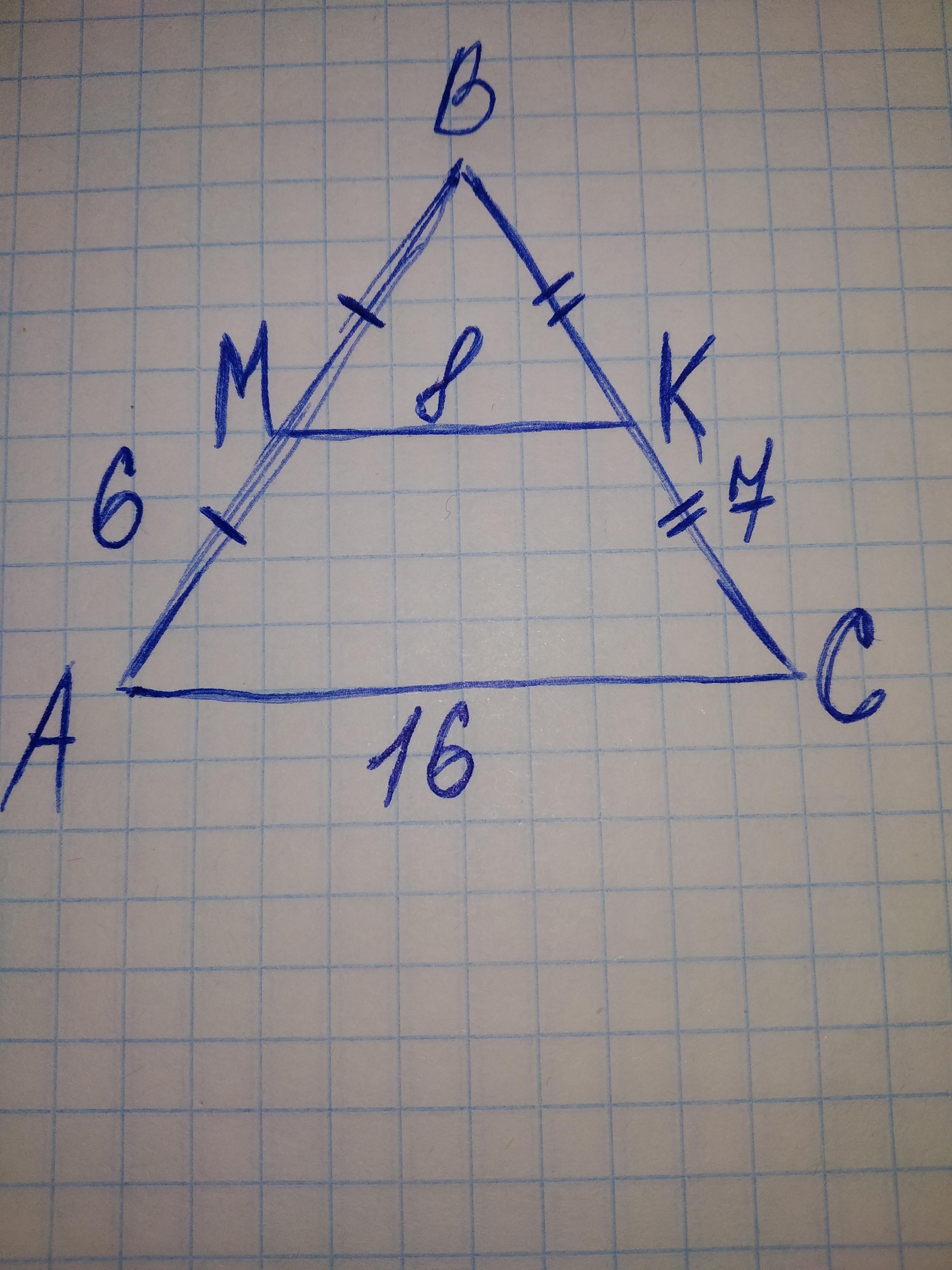 МК-средняя линия ∆АВС. Так как средняя линия соединяет середины двух сторон треугольника, то АМ=МВ=6, ВК=КС=7. Равс=42.