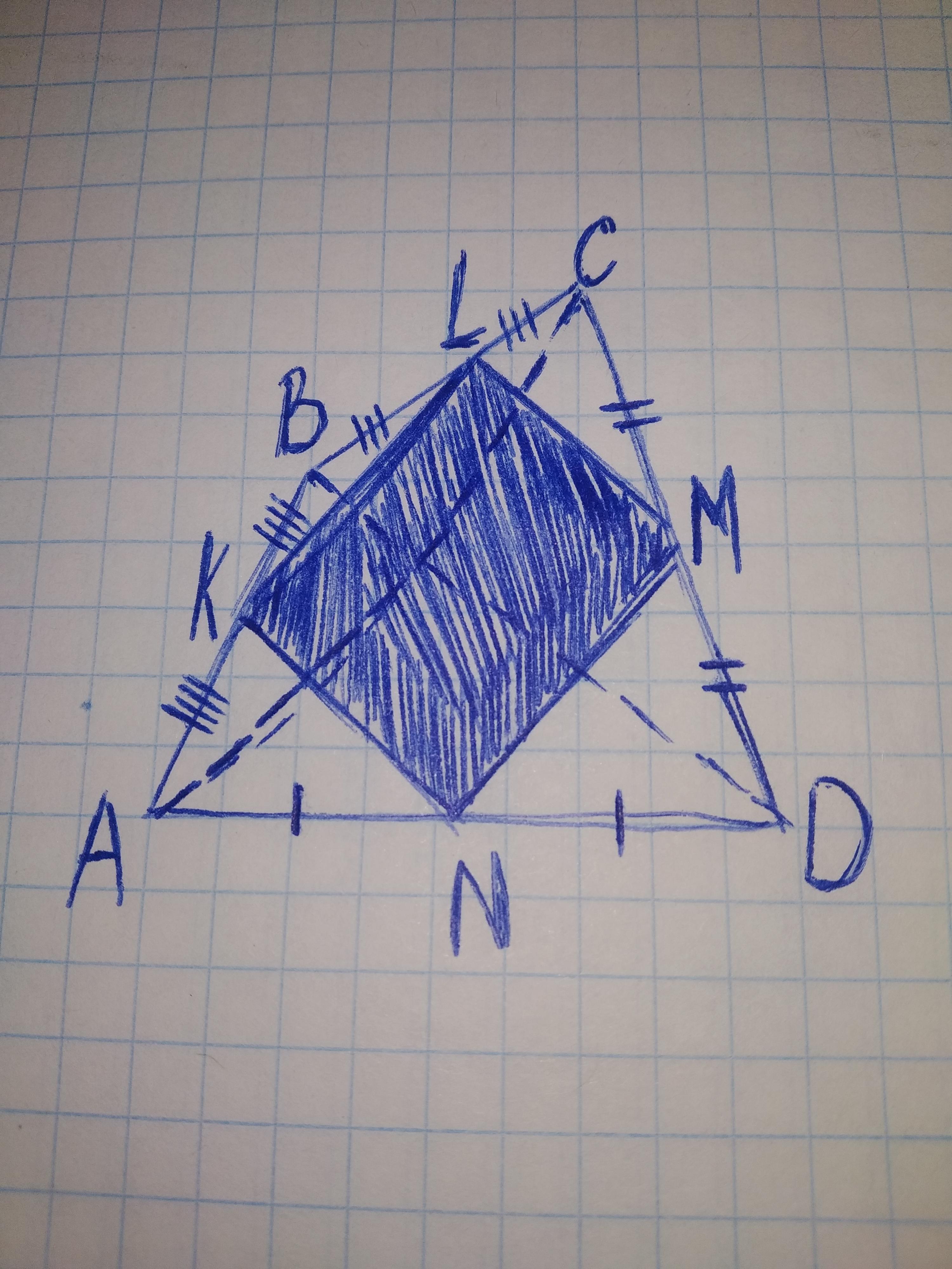 Если соединить середины сторон, то мы получим среднии линии треугольников.