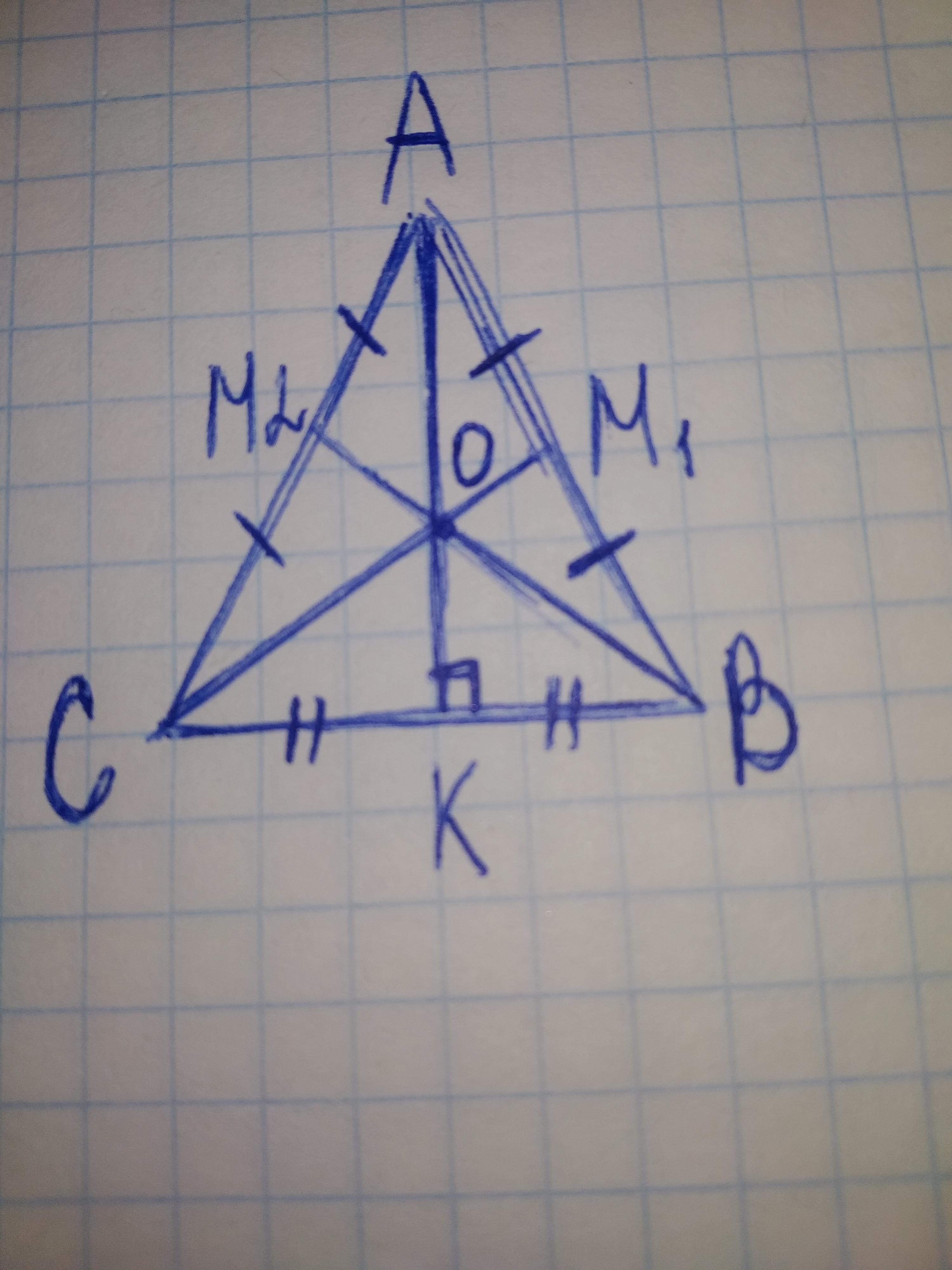 Так как АС=АВ, то ∆АВС-равнобедренный с основанием СВ. В равнобедренном треугольнике высота является медианой. Следовательно, АК-медиана СВ, СК=КВ. Проведём медиану ВМ2 к стороне СА. Все медианы пересекаются в точке О. Медиана, точкой пересечения делится в отношении 2:1. Если ОК=3, то