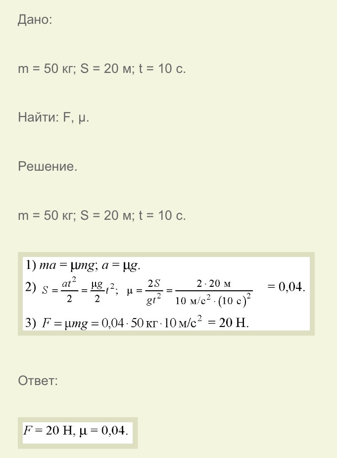 мальчик, маса которого 50 кг, спустившись на санках с горки, проехал по горизонтальной дороге (пока не остановился) путь 20 м за 10 с. определить силу трения и коэффициент трения