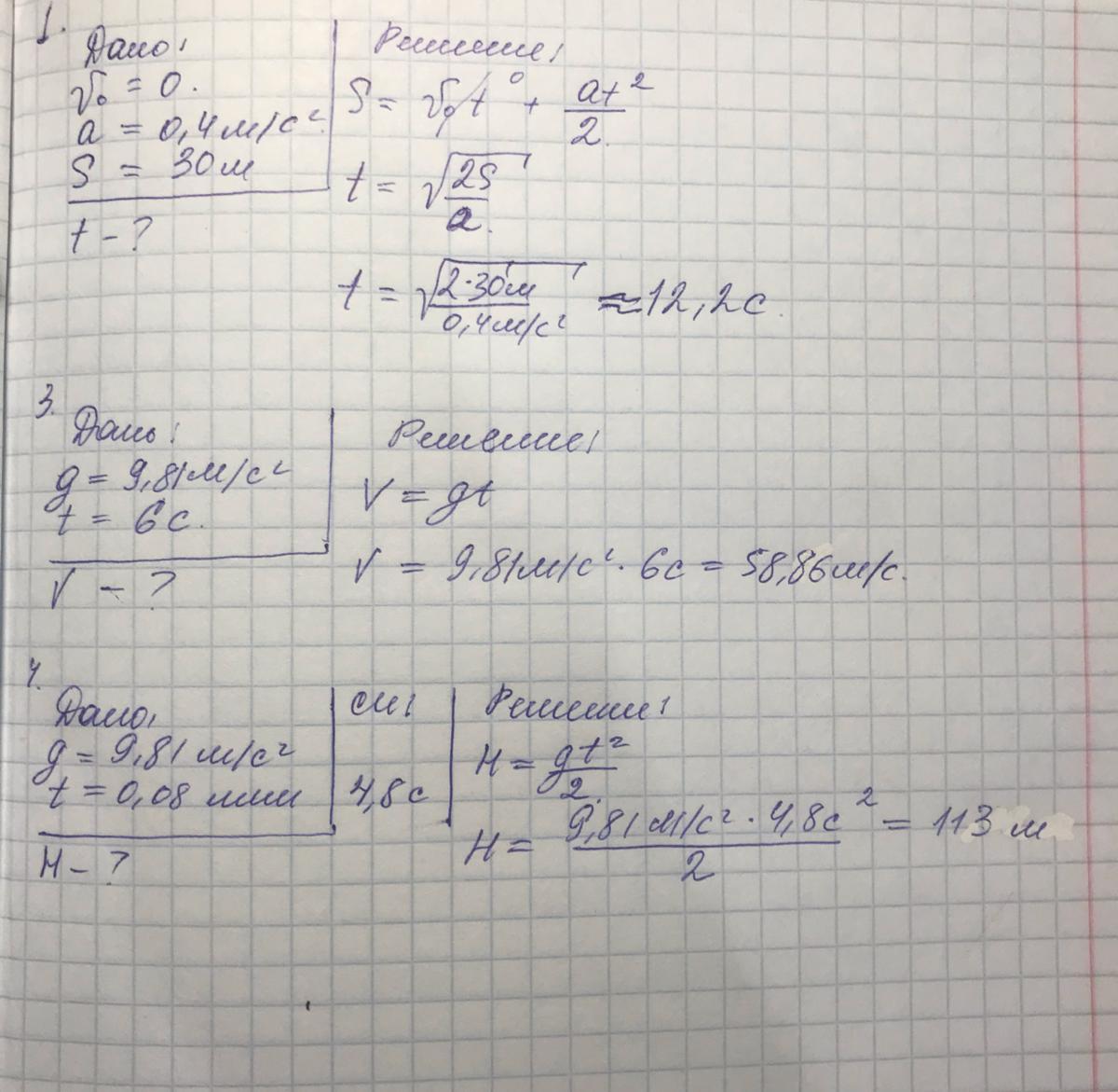 1. За какое время автомобиль, двигаясь из состояния покоя с ускорением 0,4 м/с², пройдет 30м?