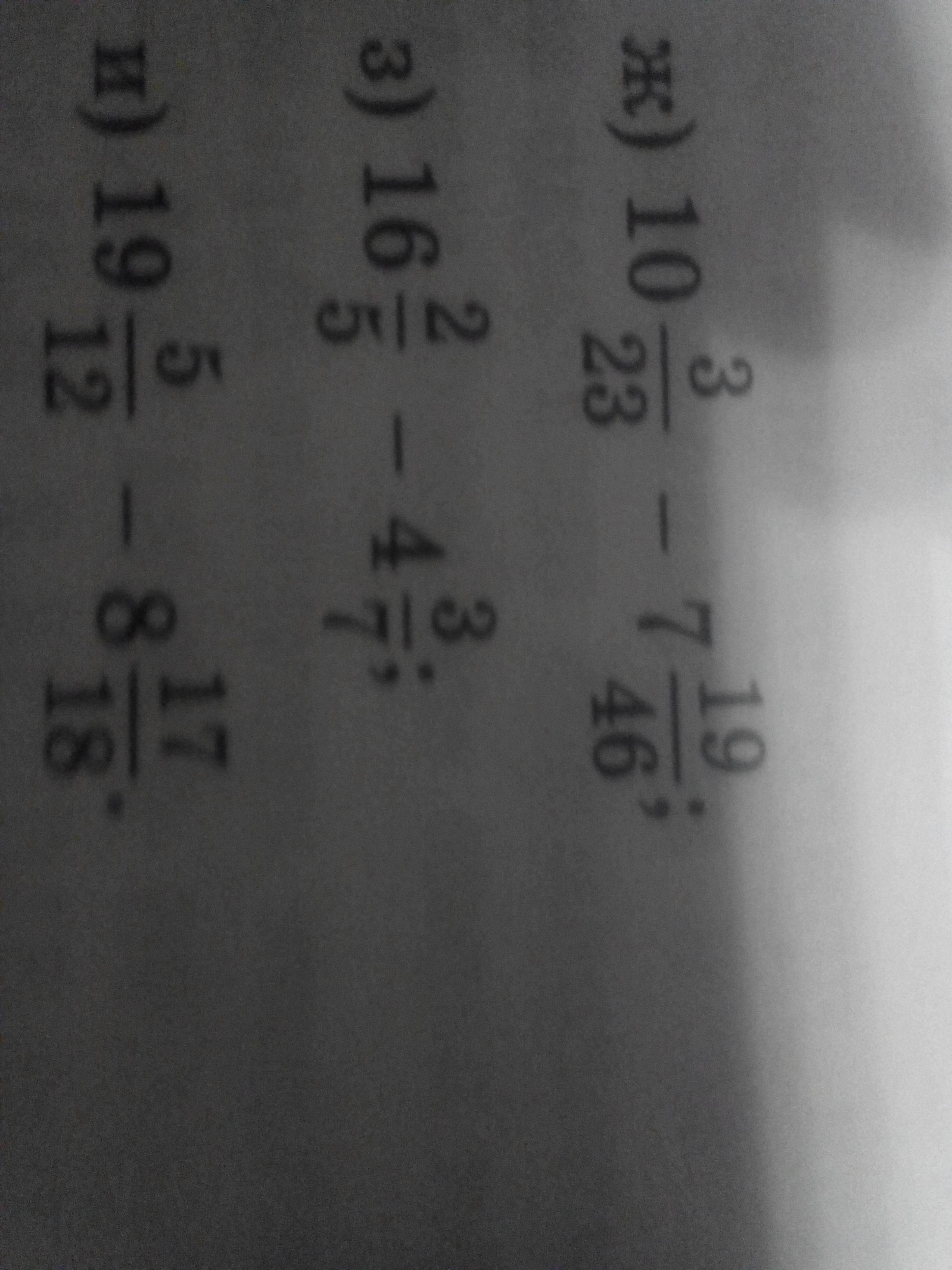 1)233/23-341/46=(466-341)/46=125/46=2 33/46 2)16 целых 2/5- 4 целых 3/7= 16 (2•7)/(5•7) - 4 (3•5)/(7•5)= 16 14/35- 4 15/35= 15 (35•1+14)/35- 4 15/35= 15 49/35- 4 15/35= 11 34/35. 3)19 целых 5/12 - 8 целых 17/18= 19 (5•3)/(12•3) - 8 (17•2)/(18•2)= 19 15/36- 8 34/36= 18 (36•1+15)/36 - 8 34/36= 18 51/36 - 8 34/36= 10 17/36