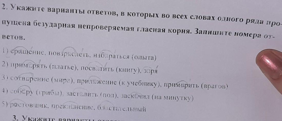 укажите варианты ответов, в которых во всех словах одного ряда пропущена безударная непроверяемая главсная корня. Запишите номера ответов. И почему выбрали эти варианты ответов