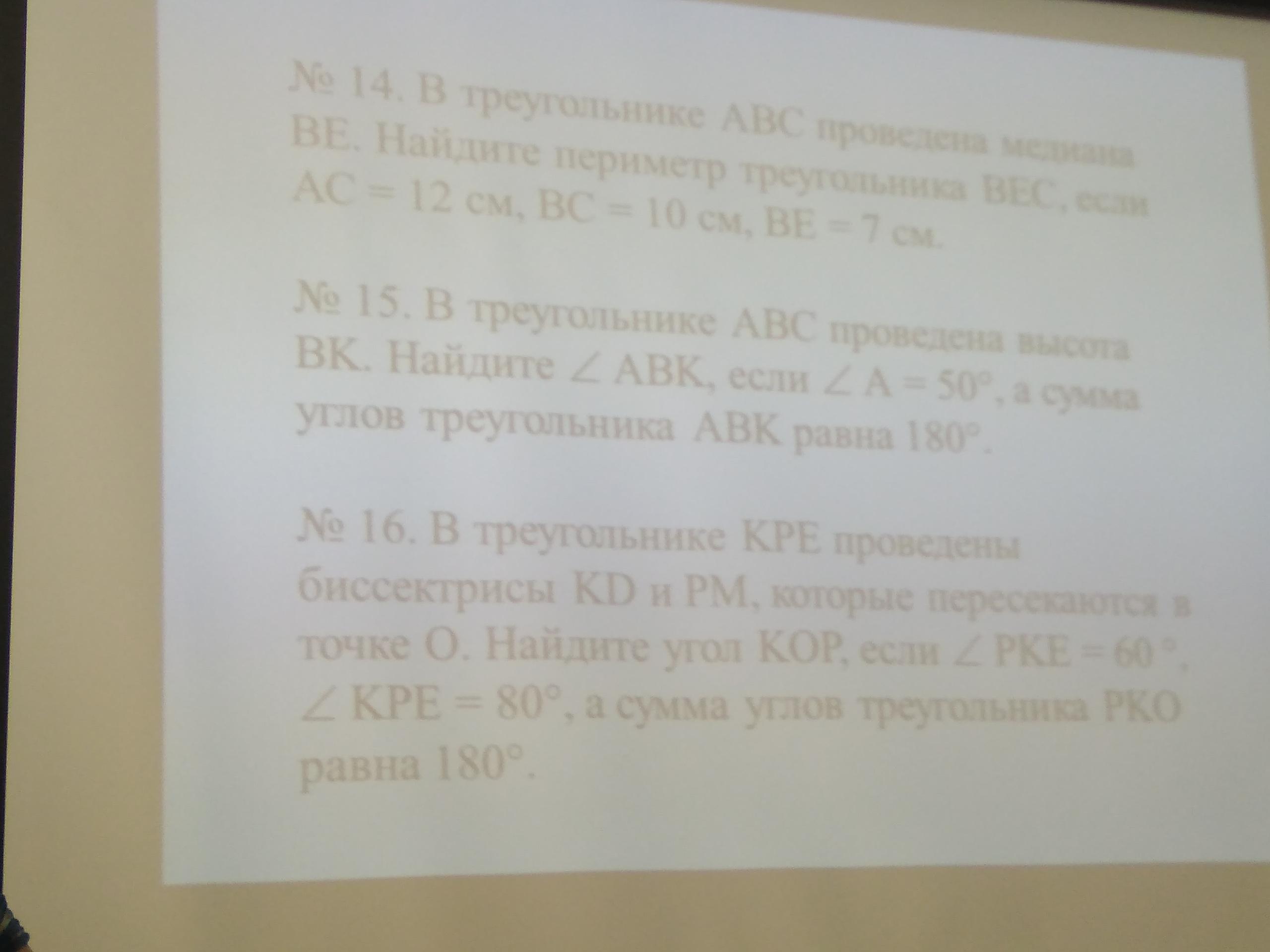 №15 угол А =50°,а угол ВКА=90°, т.к. ВК-высота, тогда угол АВК=180-(50+90)=40°