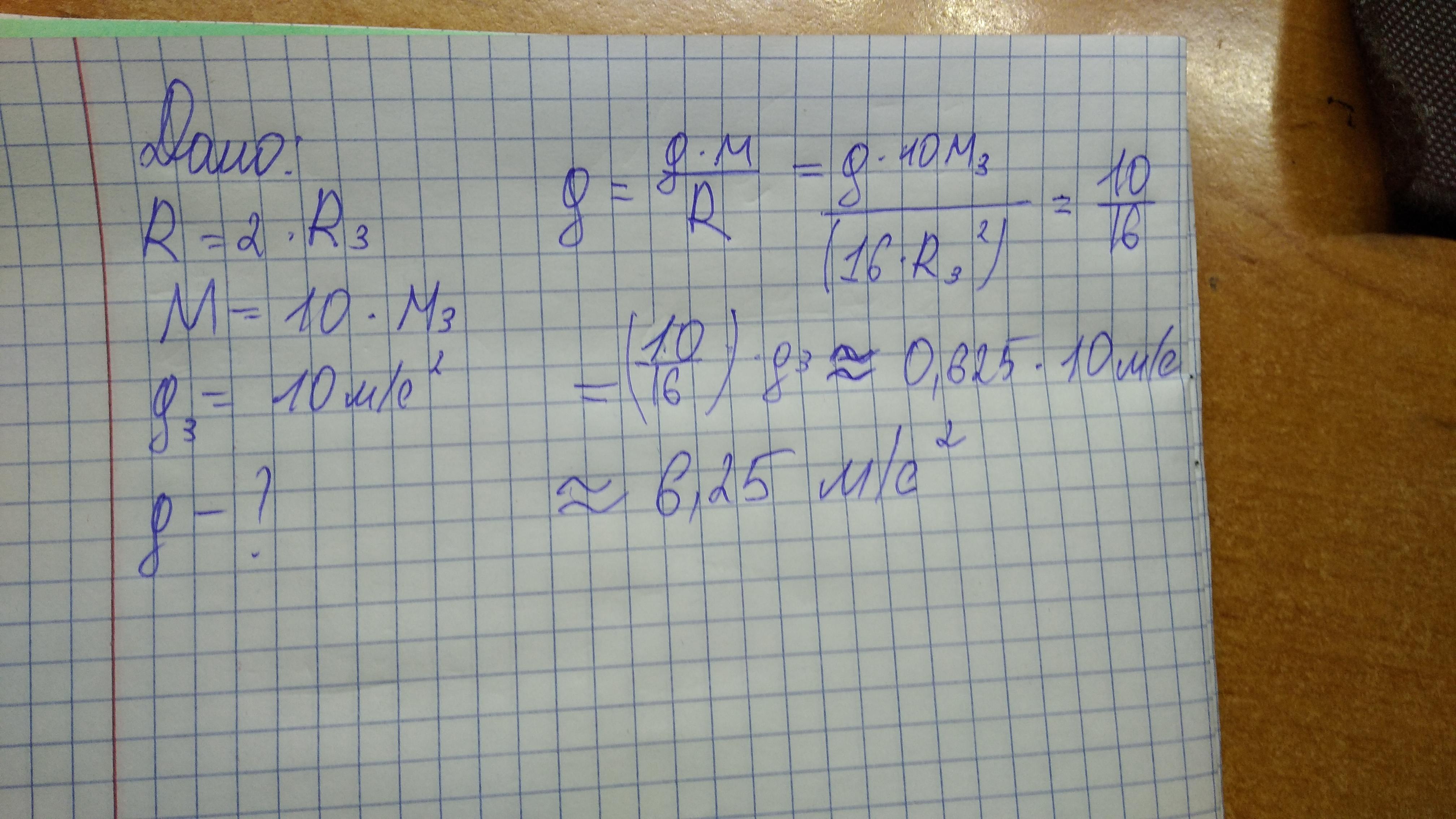 Определите ускорение свободного падения на планете, радиус которой вдвое меньше радиуса Земли, а масса в 10 раз меньше массы Земли. Считайте, что планета не вращается.