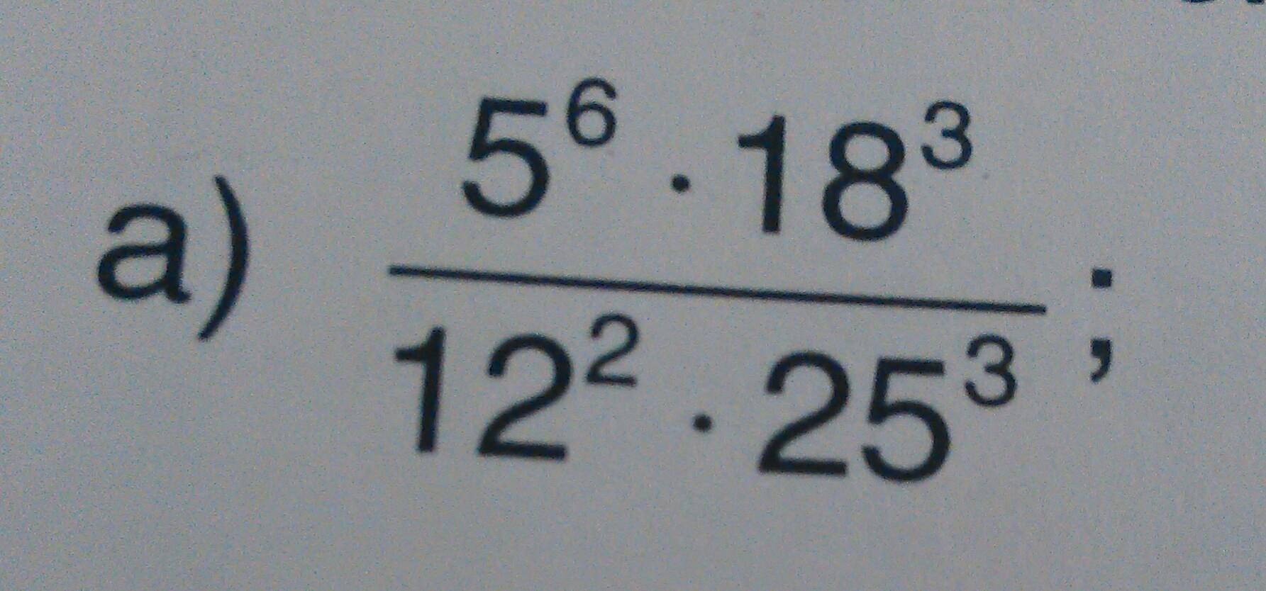 5и25 сокращаются место 5 будет 1 а место 25 будет 5 , место 18 будет 3 а место 12 будет 2 , получится 1в 6 степени × на 3 в 3 степени ÷ на 2 во 2 степени × на 5 в 3 степени = 6×27÷4×125=162÷500=0,324