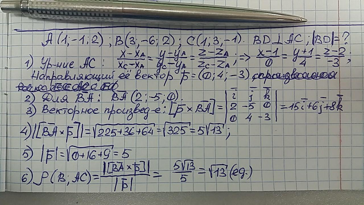 даны вершины треугольника A(1;-1;2) B(3;-6;2) C(1;3;-1) вычислить длину его высоты опущенной из вершины B