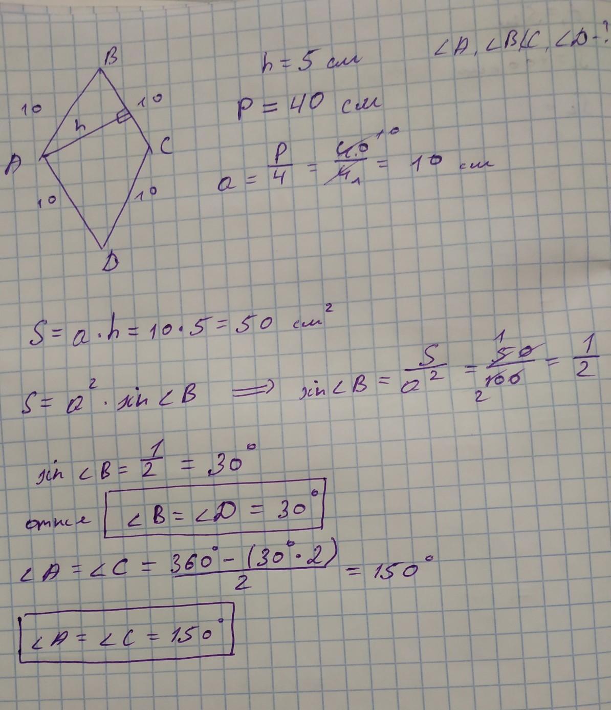Знайди кути ромба, висота якого 5 см, а периметр становить 40 см.