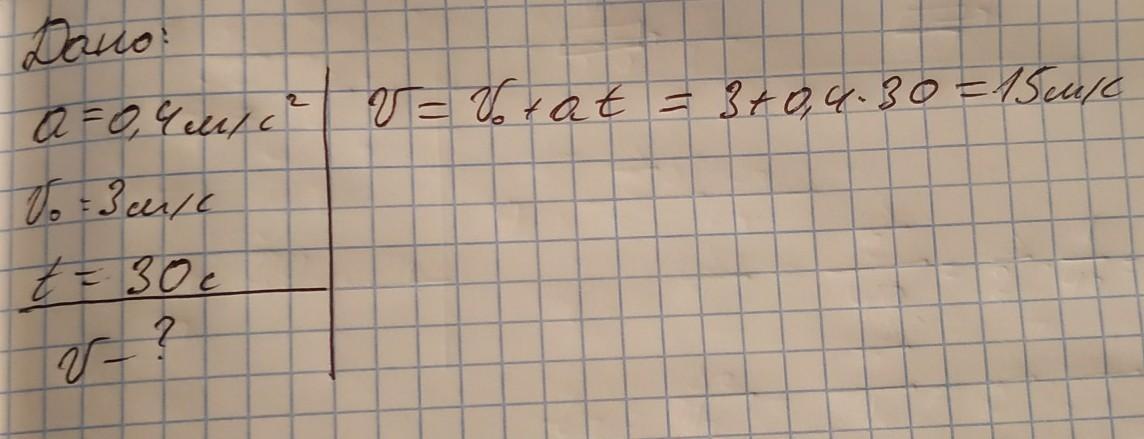 Кокую скорость приобретает тело движущееся с ускорением 0,4м/с2 и начальной скоростью 3м/с через 3м/с через 30 с после начала движения