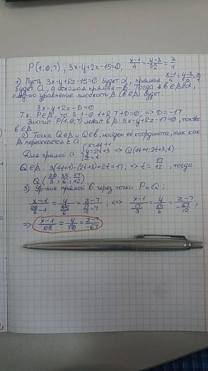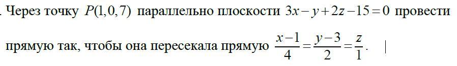 Кратко ход: 1) найти уравнение плоскости, которая содержит точку Р, а также параллельна плоскости 3х-y+2z-15=0; 2) найти точку пересечения плоскости из п. №1 с прямой, заданной в условии; 3) найти уравнение прямой, проходящей через точку Р и точку, найденную в п.№2.