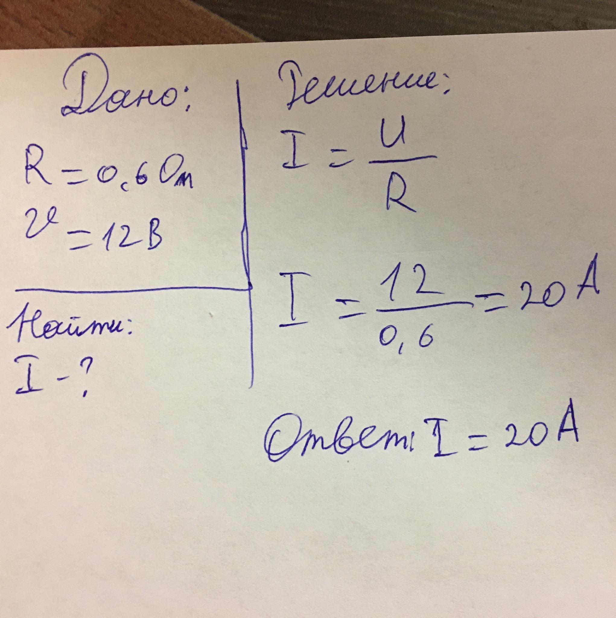 - При запуске мотора автомобиля к полюсам аккумулятора напряжением 12 В подключается обмотка стартёра электрическим сопротивлением 0,6 Ом. Чему равна при этом сила тока в цепи? -