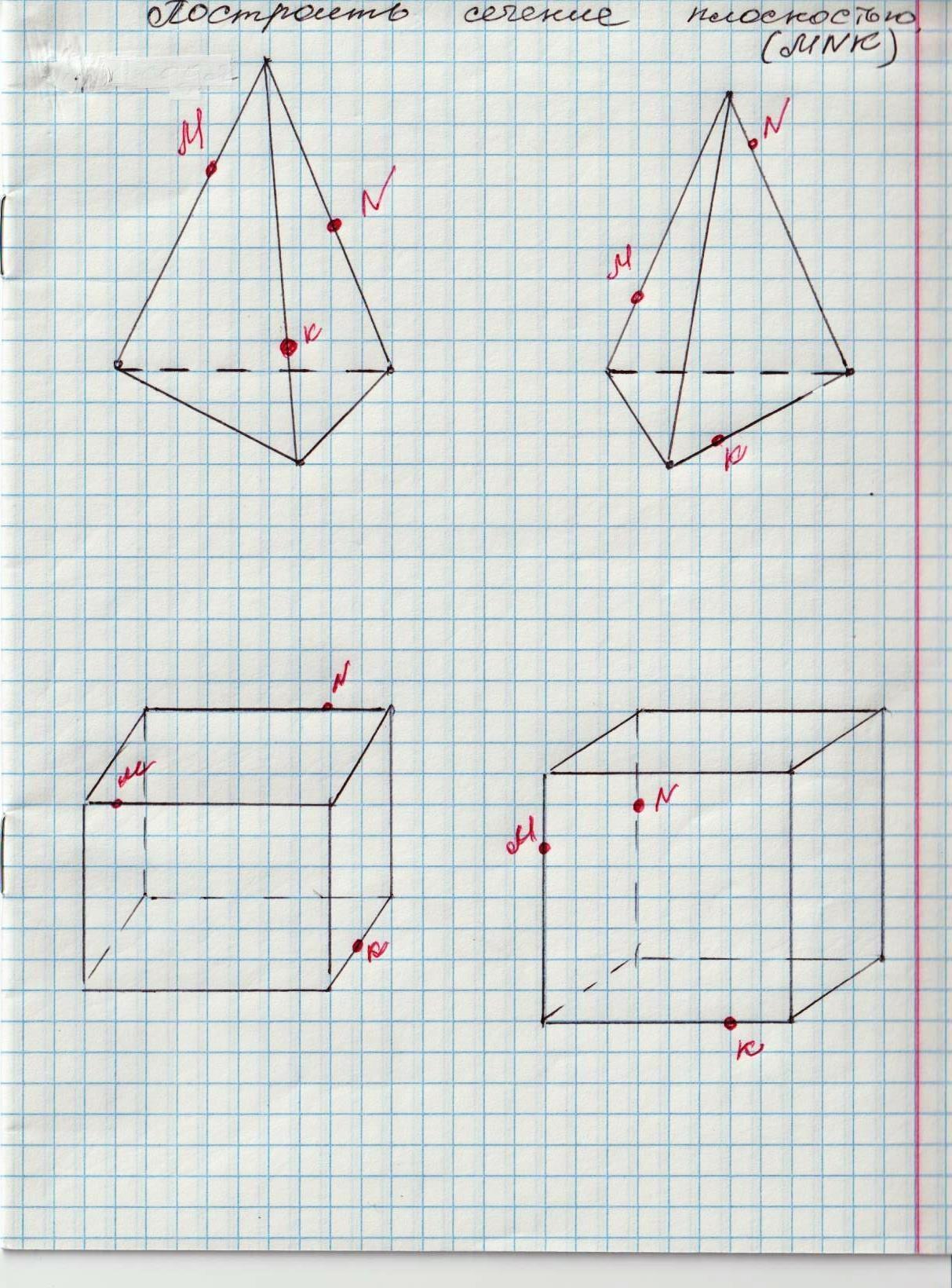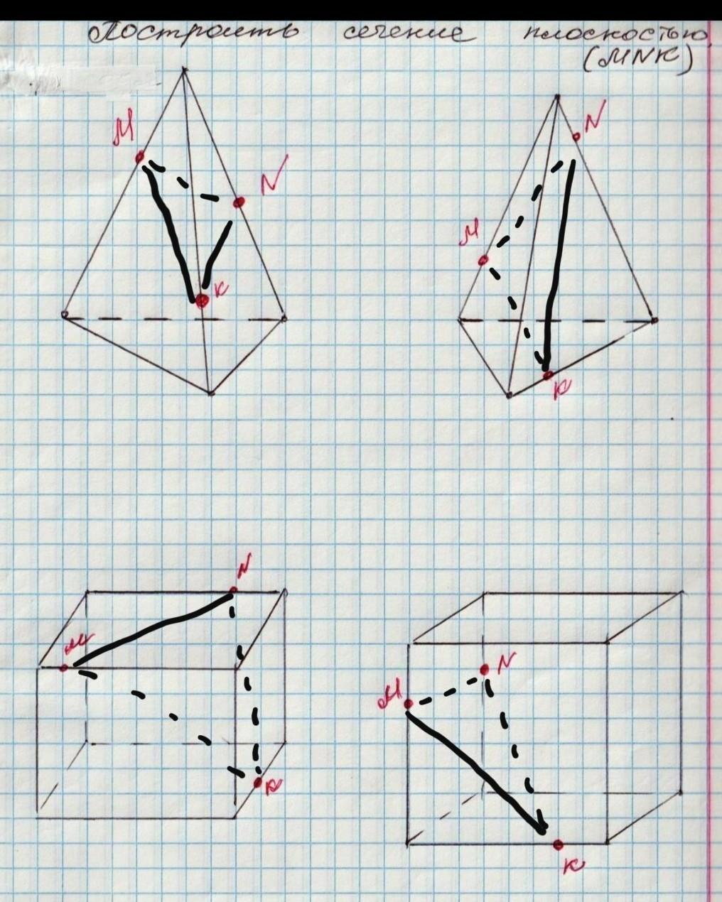 Если сечение вне зоны видимости - то оно показывается пунктирной линией, как у нарисованных фигур. На переднем плане сечение показывается обычной линией.