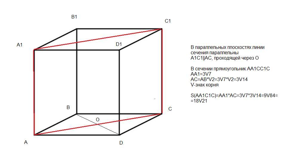 Постройте сечение куба плоскостью проходящей через точки А1,С1 и О. О- центр грани ABCD. Найдите площадь сечения если длинна куба равна 3√7. С чертежом ...