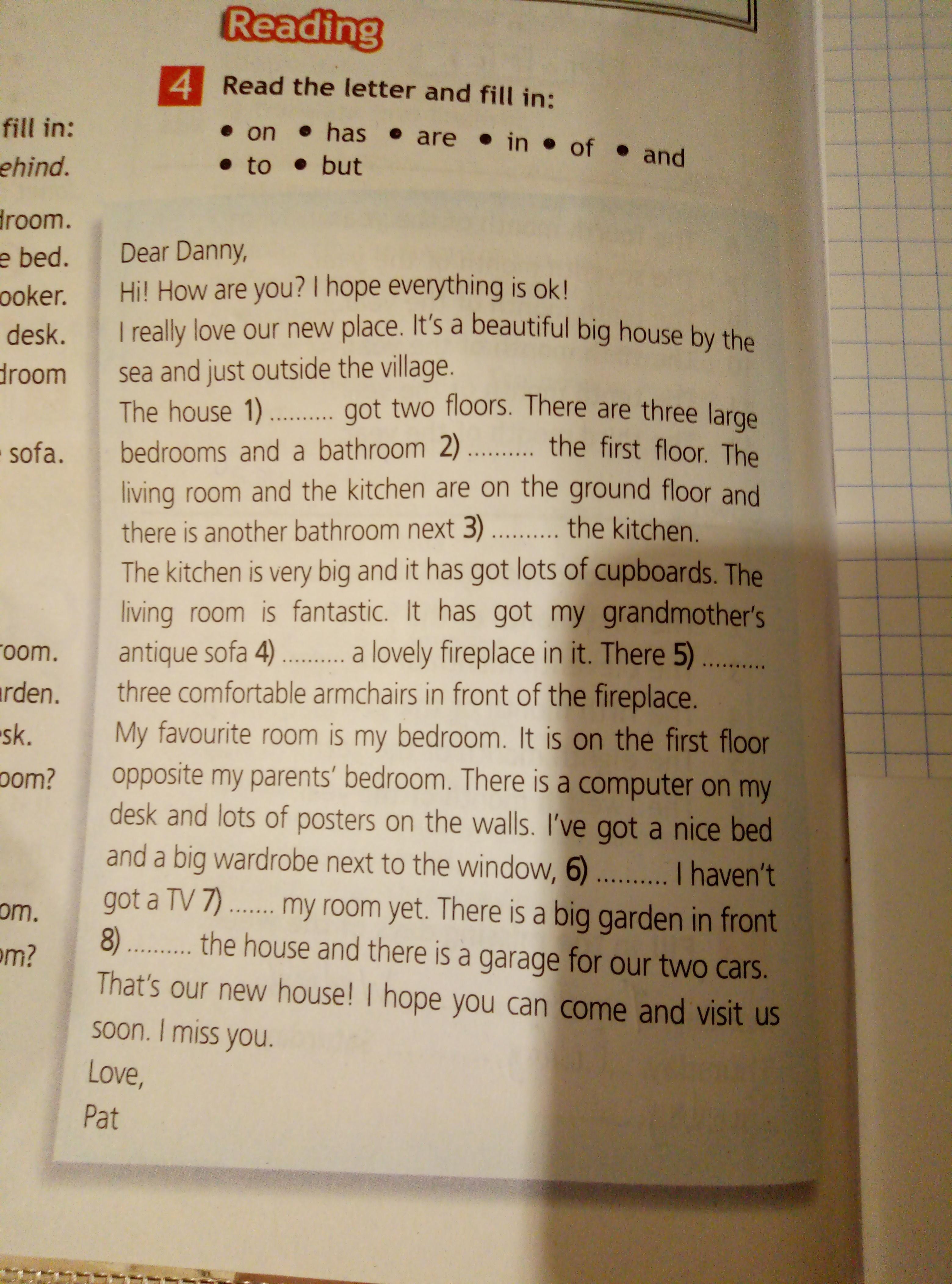 1)Has 2)on 3)next to 4)on 5)are 6)but 7)in 8)in front of Вроде правильно)