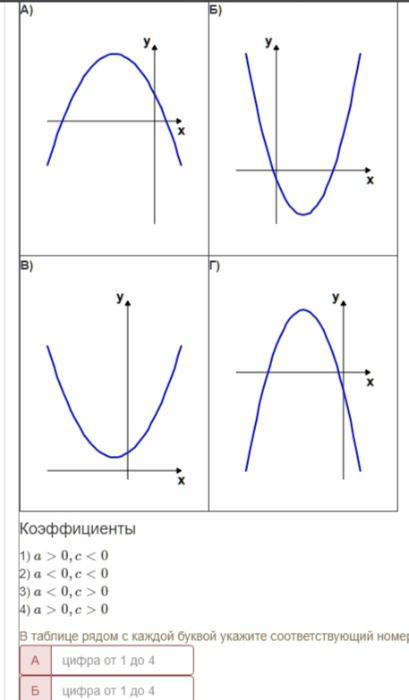 На рисунках изображены графики функций вида y=ax2+bx+c. Установите соответствие между графиками функций и знаками коэффициентовa и c.