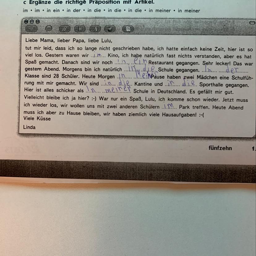 Мне жаль, что я долго не писала, у меня просто не было времени, здесь так много всего происходит! Вчера мы были в кино, я, конечно же, ничего не поняла, но мне понравилось. После этого мы еще пошли в ресторан. Было очень вкусно! Это было вчера вечером. Утром я, конечно, пошла в школу. В классе 28 учеников. Сегодня утром в перерыве 2 девочки провели для меня экскурсию по школе. Мы ходили в школьную столовую и спортзал. Здесь все намного более шикарно, чем в моей школе в Германии. Мне здесь нравится. Может быть, я здесь и останусь? :-) Нет, это я просто только пошутила, Лулу, я все же вернусь. Сейчас мне уже надо идти, мы хотим с двумя другими учениками встретиться в парке. Но сегодня вечером мне надо будет остаться дома, у нас достаточно много домашнего задания :-(