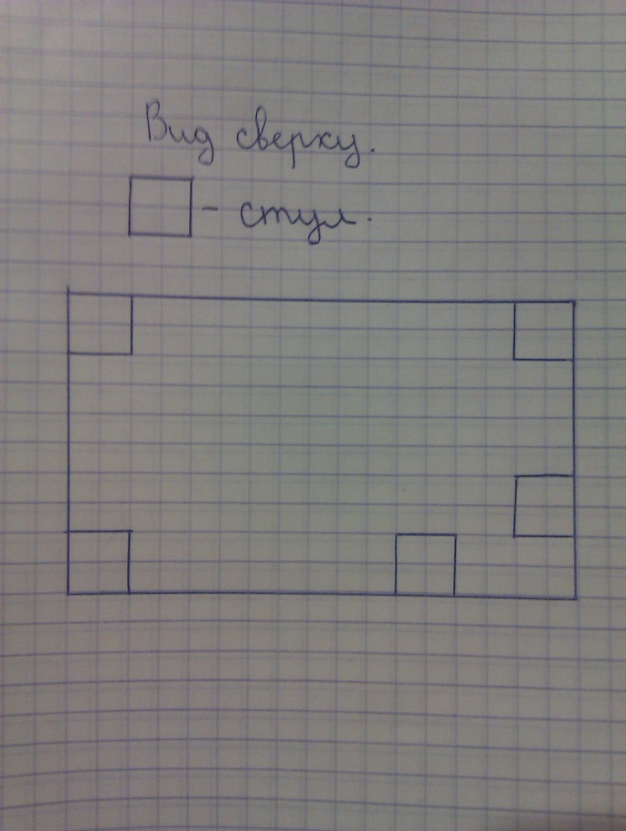 У комнаты четыре стены, значит мы поставим к трем углам по одному стулу, а к четвертому углу у двух стен расставим еще по одному стулу.