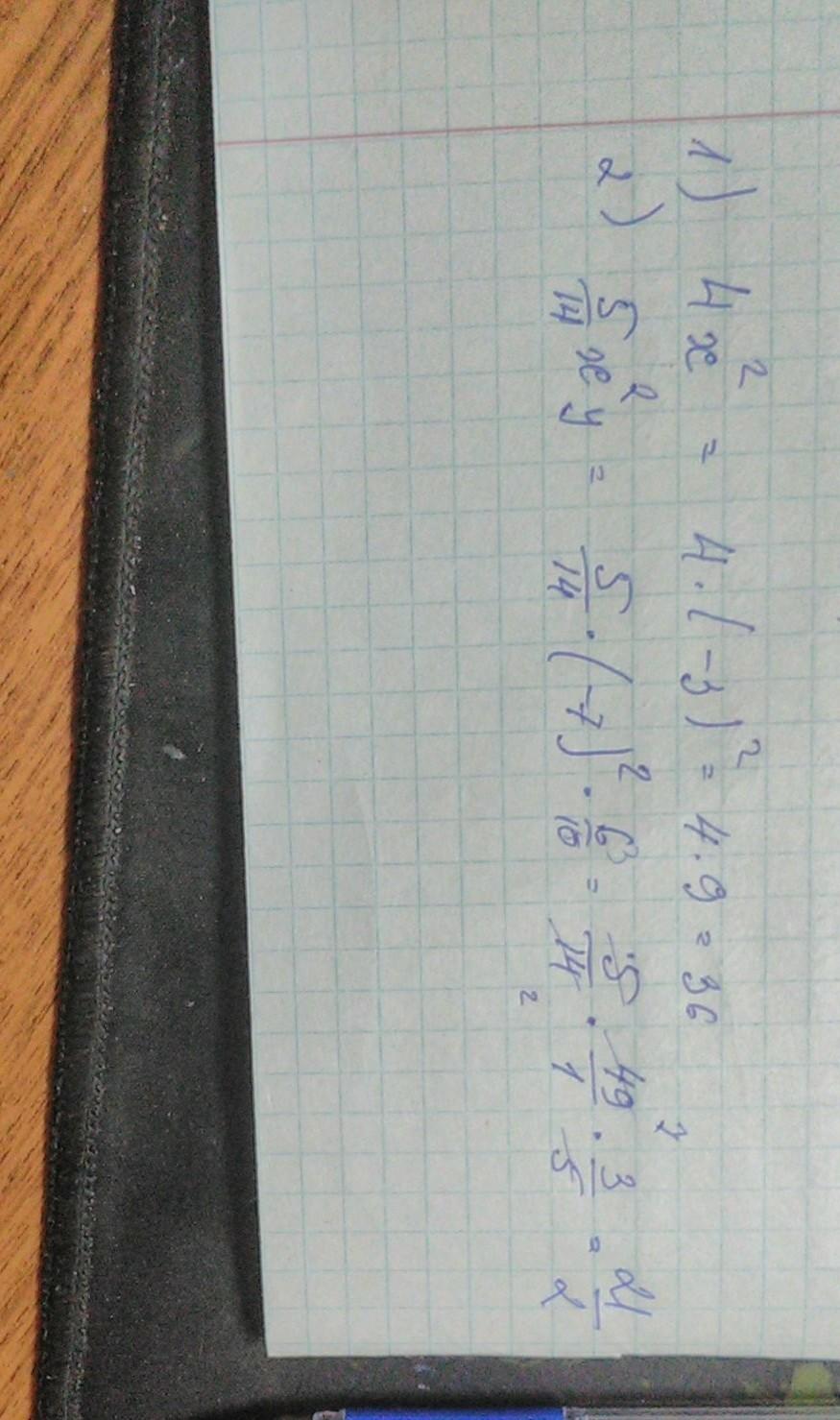Найдите значение одночлена 1)4x во 2 степени, если x=-3 2)5|14 x во второй степени y, если x=-7,y=0,6 пожалуйста