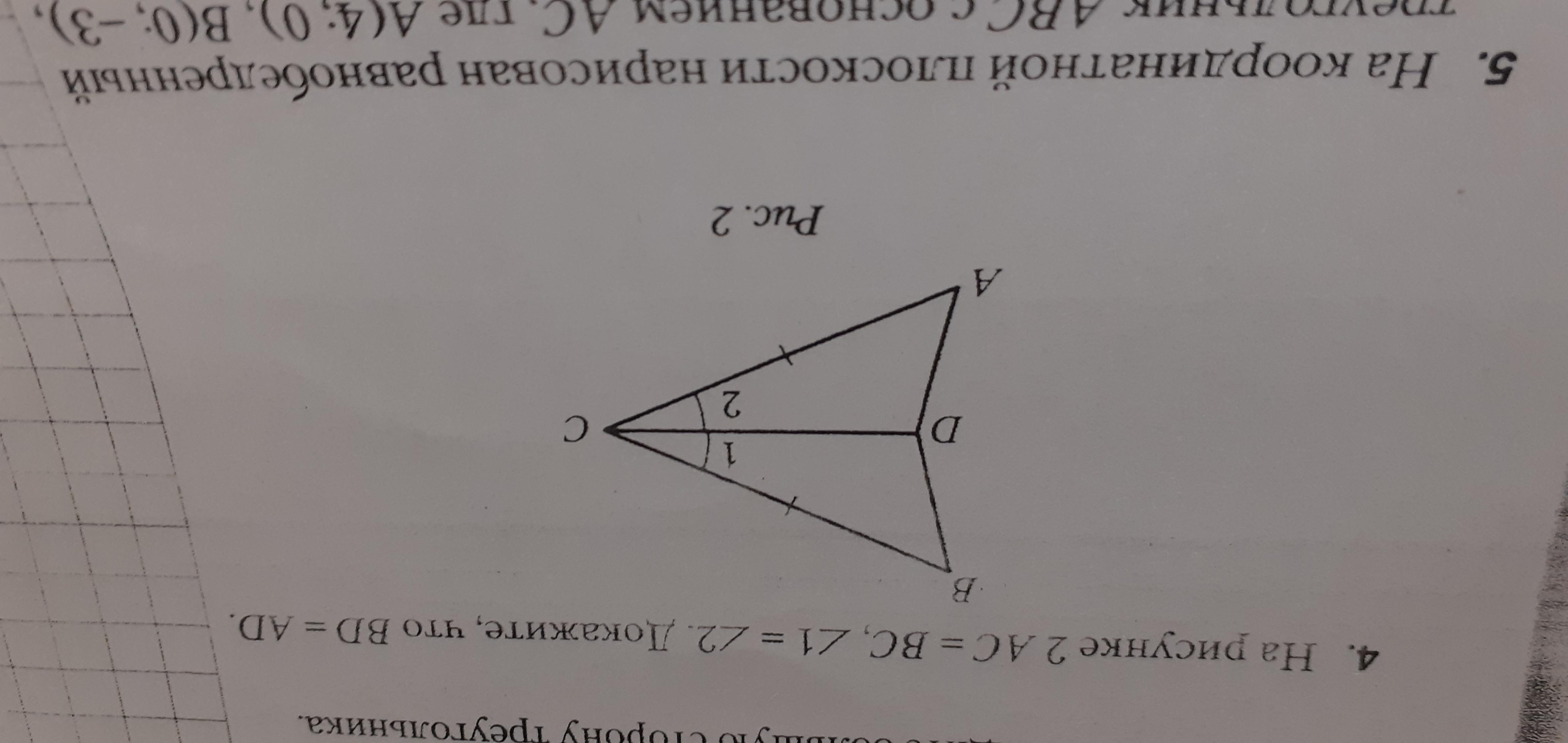 Рассмотрим треугольники DBC и DAC. По первому признаку равенства треугольников мы можем сказать, что они равны (угол и прилежащие к нему стороны первого треугольника соответственно равны углу и прилежащим к ним сторонам второго треугольника). Если эти треугольники равны, то => BD = AD.