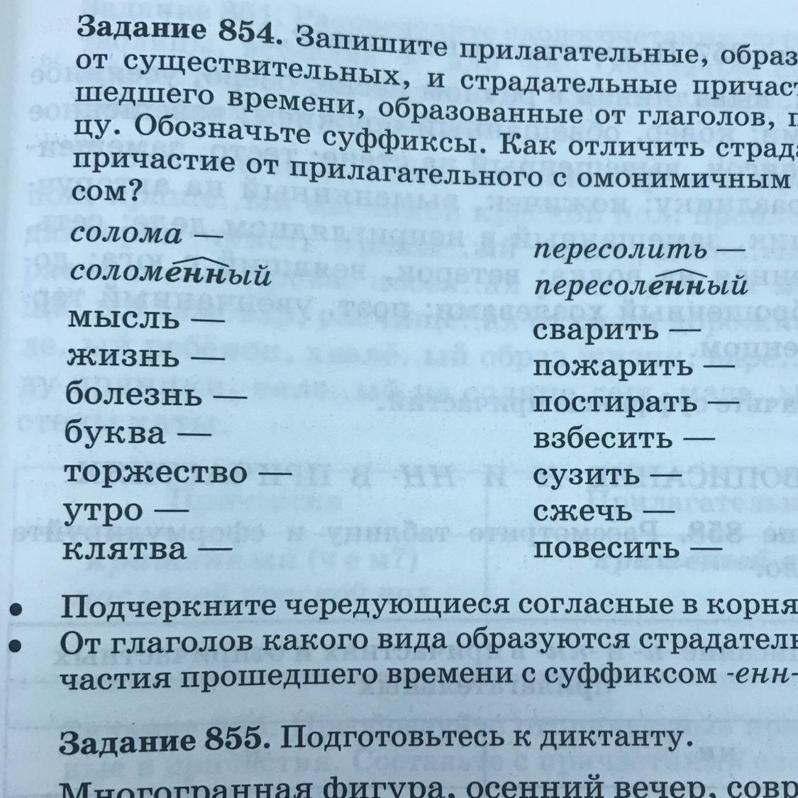 Запишите прилагательные, образованные от существительных, и страдательные причастия прошедшего времени, образованные от глаголов, по образцу. Обозначьте суффиксы. Как отличить страдательное причастие от прилагательного с омонимичными суффиксом?