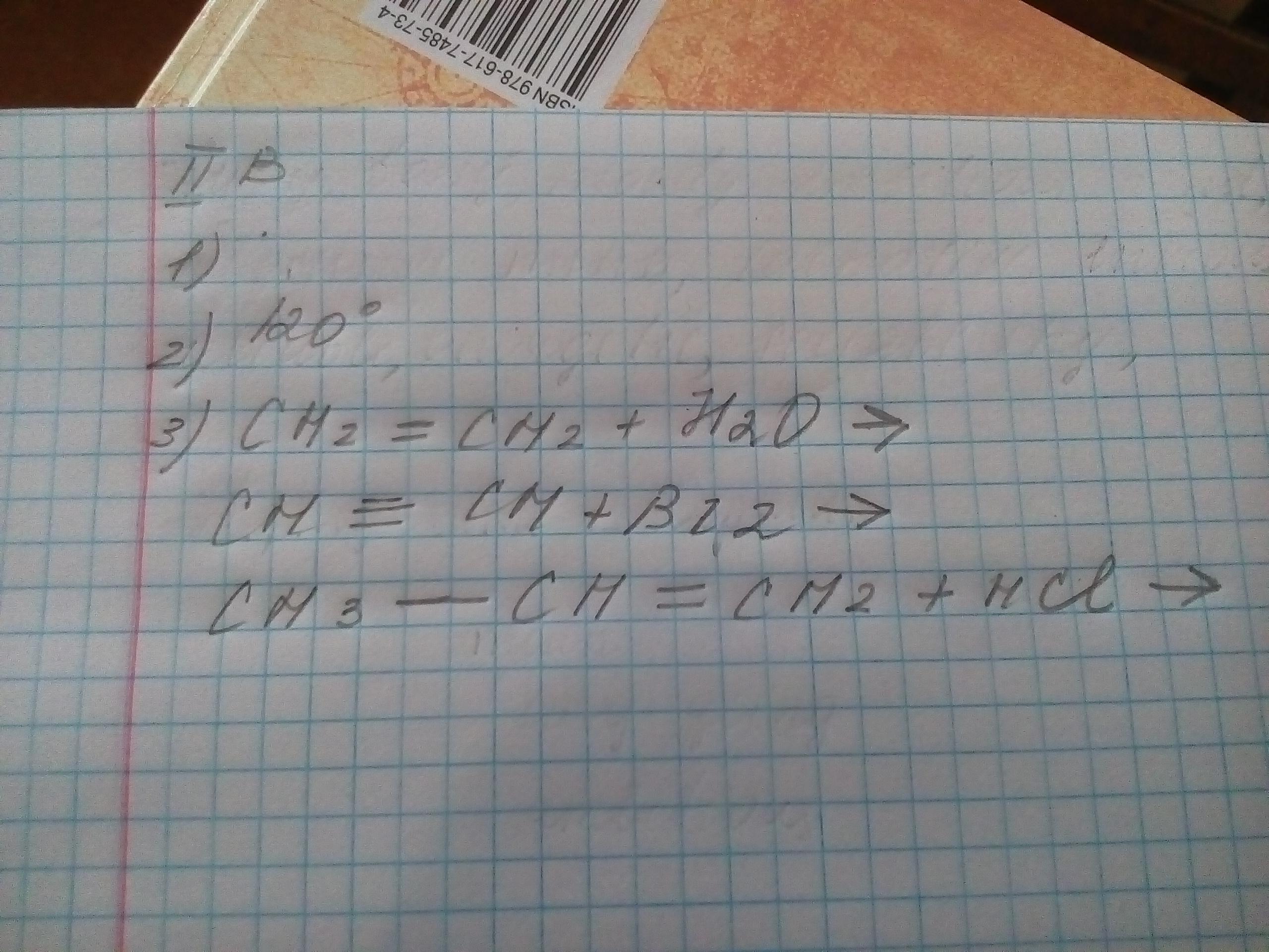 3) СН3-СН=СН2 + HCl⇒СН3-СНСl-СН3 (в соответствии с правилом Марковникова водород присоединяется к более гидрогенизированному атому, а хлор к менее)