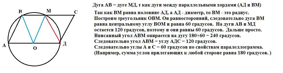Окружность, построенная на стороне AD параллелограмма ABCD как на диаметре, проходит через вершину B и середину стороны BC. Найдите углы параллелограмма.