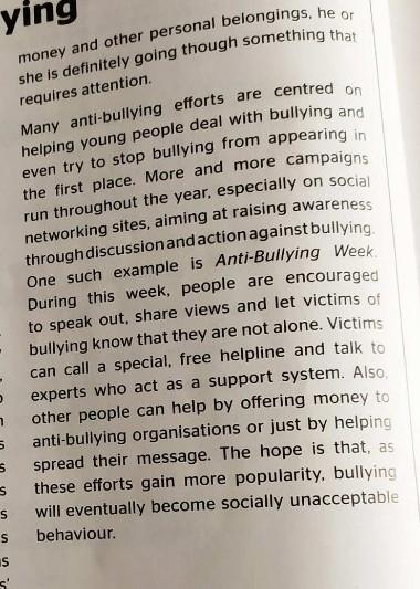 Багато зусиль, спрямованих проти знущань, зосереджені на тому, щоб допомогти молодим людям боротися із знущаннями і навіть намагатися не допустити появи знущань в першу чергу. Протягом року проводиться все більше та більше кампаній, особливо на сайтах соціальних мереж, спрямованих на підвищення обізнаності шляхом обговорення та дій проти знущань. Одним із таких прикладів є Тиждень боротьби з насильством. Протягом цього тижня людей рекомендують висловлюватися, ділитися думками та давати жертвам знущань знати, що вони не самотні. Потерпілі можуть зателефонувати на спеціальну, безкоштовну лінію довіри та поговорити з експертами, які виступають в якості системи підтримки. Також інші люди можуть допомогти, пропонуючи гроші організаціям проти знущань або просто допомагаючи поширювати свої повідомлення. Сподіваємось, що, коли ці зусилля набуватимуть більшої популярності, знущання з часом стануть соціально неприйнятною поведінкою.