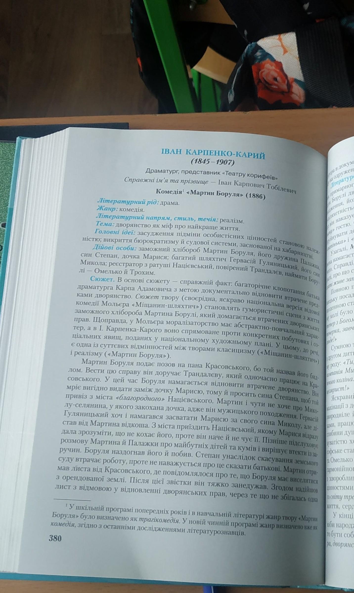 ПАСПОРТ ТВОРУ Рід літератури «Мартин Боруля»: драма. Жанр «Мартин Боруля»: трагікомедія (комедія в 5-ти діях — так визначив жанр твору автор), Тема «Мартин Боруля»: сатиричне зображення заможної верхівки села, що в гонитві за дворянськими привілеями ігнорує здорові моральні норми. Ідея «Мартин Боруля»: утвердження думки, що гідність людини визначає не належність до привілейованого соціального стану, а чесна праця, простота і щирість у стосунках з людьми; смішна та людина, яка соромиться бути собою, захоплюється фальшивими цінностями, з усіх сил намагається пристосуватися до швидкоплинної моди. Художній напрям «Мартин Боруля»: реалізм. Дійові особи: Мартин Боруля, заможний хлібороб, його дружина Палажка, син Степан, донька Марися; Гервасій Гуляницький, багатий шляхтич, його син Микола; Націєвський — реєстратор з ратуші; повірений Трандалєв; Протасій Пе- ньонжка, Матвій Дульський — чиншовики; Омелько, Трохим — наймити Борулі. Сюжет, композиція «Мартин Боруля»: комедія в 5-ти діях. Події відбуваються протягом кількох тижнів. В основу сюжету твору покладено невигадану анекдотичну історію гонитви селянина за дворянством і втрати надії на нього через прикрий недогляд, допущений писарем у минулі часи, — розбіжність в одній-єдиній літері прізвища. Сюжет комедії «Мартин Боруля» письменник побудував на фактах з життя родини Тобілевичів: батько драматурга, який тривалий час служив управителем поміщицьких маєтків, вирішив домогтися визнання свого роду дворянським. На це витратив чимало часу, але марно — дворянство не було доведено, оскільки прізвище в старих документах було Тебілевич, а в нових — Тобілевич. Карпенко-Карий використав цей факт, аби висміяти намагання простої людини вибитись у дворяни, хибно думаючи, що цим можна в чомусь вивищитися над іншими. Розв’язка — гостро драматична. Мартин скрізь зазнає поразки, і, нарешті, одна літера в прізвищі (Боруля — Беруля) кладе край його змаганням за дворянське звання: рід Мартина не визнали дворянським. Сюжет твору (своєрідна, яскраво національна версія відомої комедії Мольєра «Міщанин-шляхтич») становлять гумористичні сцени із життя заможного хлібороба Мартина Борулі, який домагається втрачених дворянських прав. Щоправда, у Мольєра моралізаторство має абстрактно-повчальний характер, а в Карпенка-Карого воно спрямоване проти конкретних побутових і соціальних явищ, поданих у національному художньому зрізі. У цьому, до речі, одна із суттєвих відмінностей між творами класицизму («Міщанин-шляхтич») і реалізму («Мартин Боруля»), Сповнені іронії, а іноді й сарказму сцени, у яких Боруля намагається завести у своєму домі «дворянські порядки». Комізм тут досягається через разючу невідповідність між давно усталеним способом життя селянина- хлібороба й омріяною панською шляхетністю. Проблематика «Мартин Боруля»: людської гідності, усвідомлення того, що щастя не в чині або посаді; праці як духовної потреби і джерела матеріального статку; батьків і дітей; меншовартості; кохання і сімейного щастя. Примітки: Драму було надруковано у львівському журналі «Зоря» 1891 року. Завдяки добродушному народному гумору, упізнаваності, психологічній переконливості образів, гострій злободенності проблематики п’єса ось уже понад сто років з успіхом іде на сценах вітчизняних театрів.