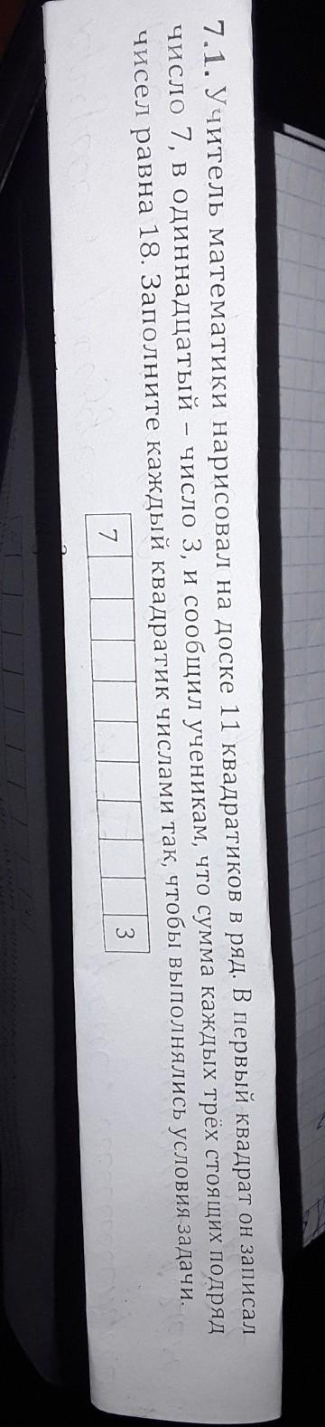 Учитель математики нарисовал 11 квадратикоа в ряд. В первый квадрат он записал число 7, в одиннадцатый- число 3, и сообщил ученикам, что сумма каждых трёх стоящих подряд чисел равна 18. заполните каждый квадрат так, чтобы выполнялись условия задачи.
