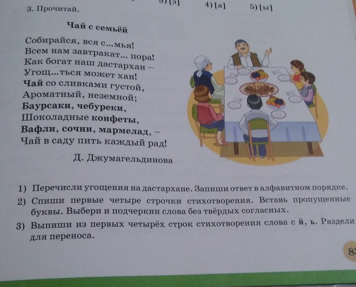 3) Со-би-рай-ся, семь-я, зав-тра-кать, у-го-щать-ся.
