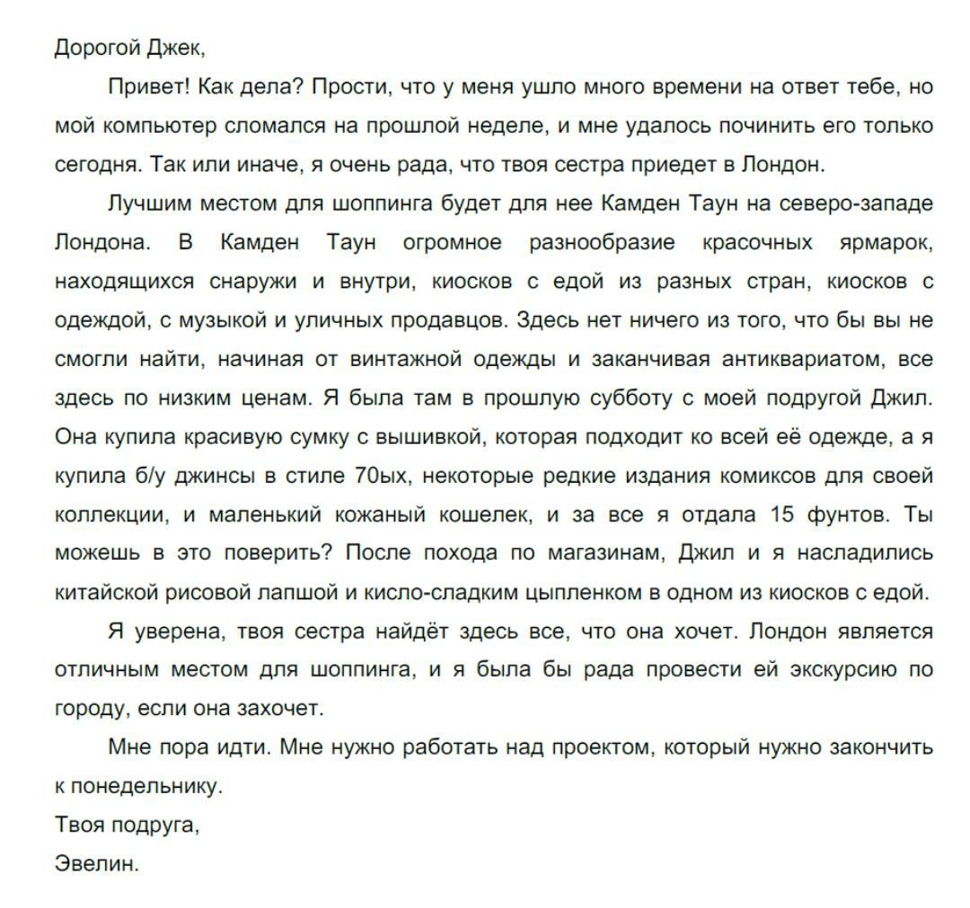 Привет! Как дела? Я по тебе очень соскучилась! Может как нибудь приедешь к нам? У нас в городе полно разных интересных мест! Например парк аттракционов. Там стоит самое большое в мире колесо обозрения! Так же у нас есть полным полно торговых центров, парков, ресторанов и кафе!