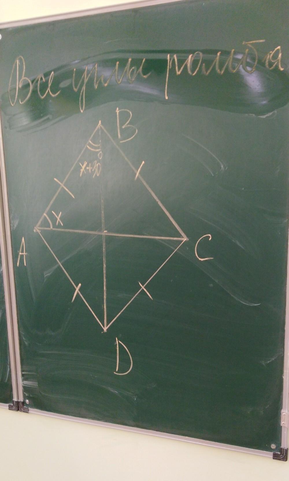 Противоположные углы ромба равны, а диагонали ромба являются биссектрисами его углов (то есть делят углы ромба пополам)