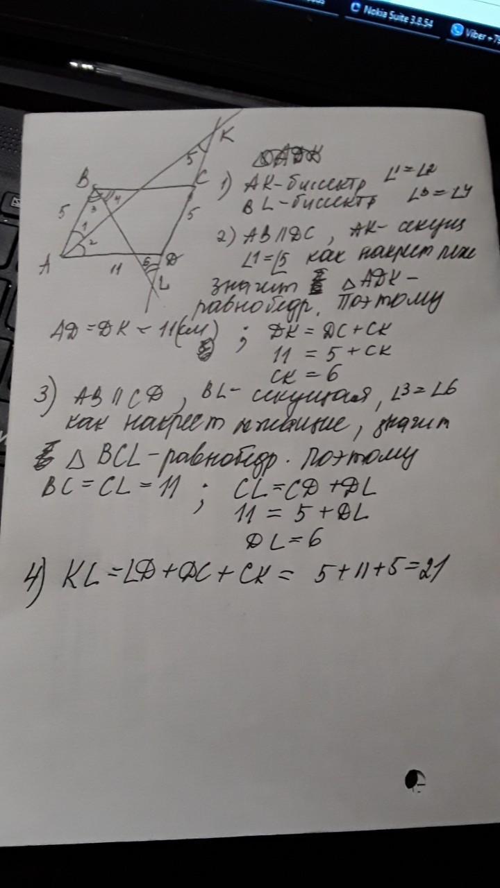 Биссектрисы углов A и B параллелограмма ABCD пересекают прямую CD в точках K и L. Найдите длину отрезка KL, если стороны параллелограмма равны 5 и 11.