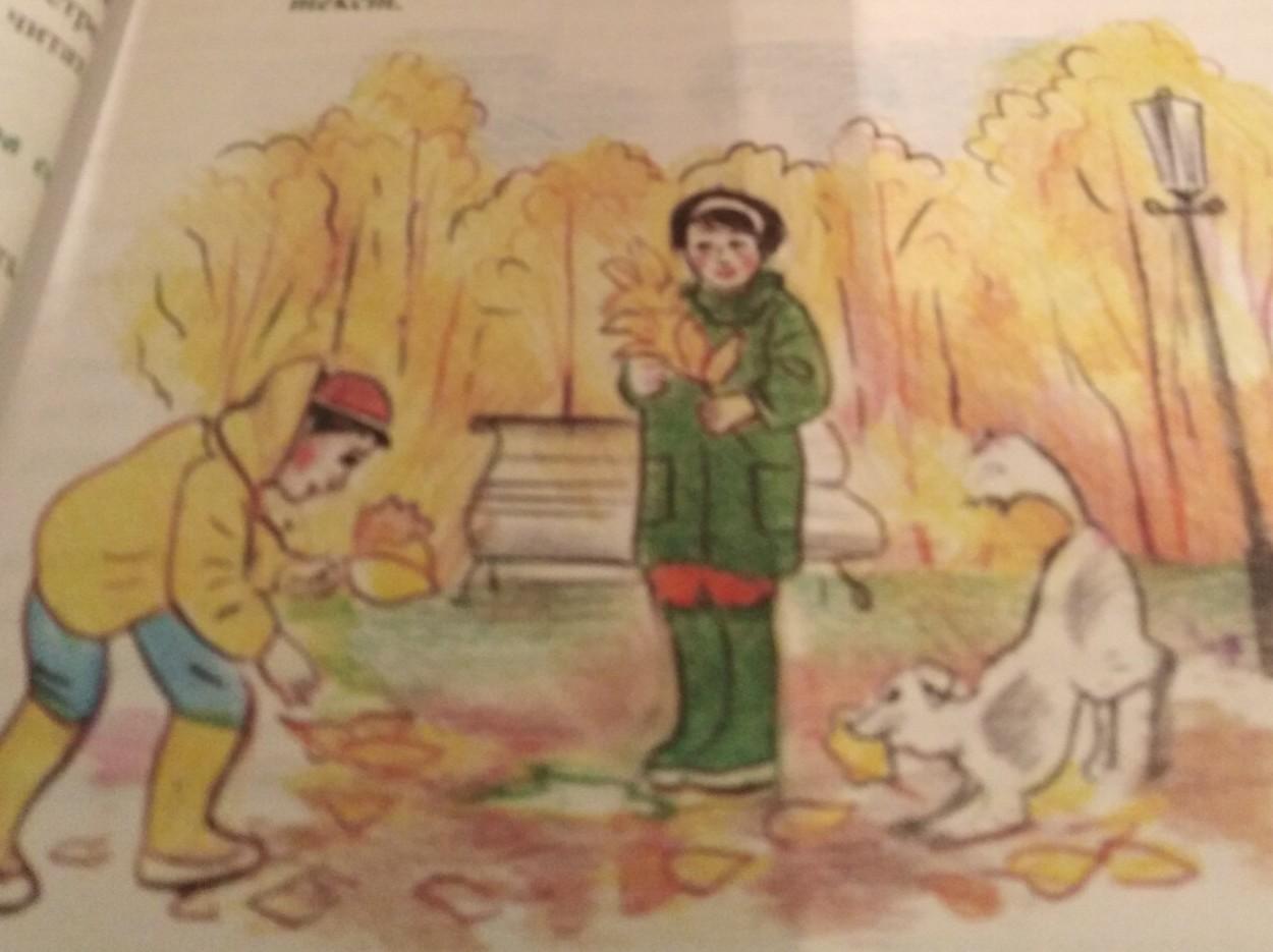 Мальчики вышли выгулять собачку, она начала громко лаять и радоваться столь пасмурной и прохладной погодке.. Пока собачка резвилась, мальчики начали собирать листья для гербария в школу. Они будут делать великолепные поделки!