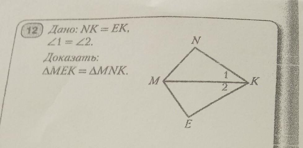 дано:NK=EK, угол 1=углу 2. доказать: треугольник МЕК=треугольнику МNK.