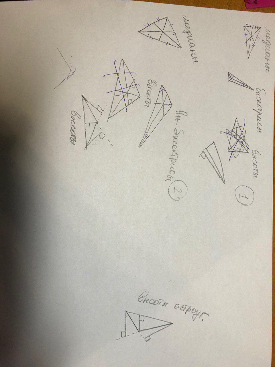 Прошу помогите ,Взять два листа А4. На одном листе построить три остроугольных треугольника ( в первом провести тир медианы, во втором - три биссектрисы, в третьем - три высоты), на втором листе построить три тупоугольных треугольника ( в первом провести три медианы, во втором - три биссектрисы, в третьем - три высоты).
