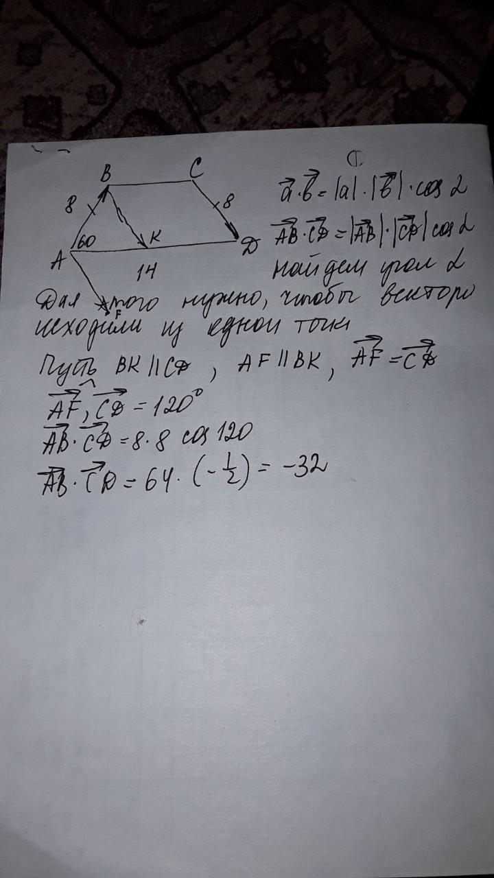 В равнобедренной трапеции ABCD один из углов равен 60 градусов,, боковая сторона равна АВ =8см, а большее основание АD=14 см. Найдите скалярное произведение векторов АВ и СD