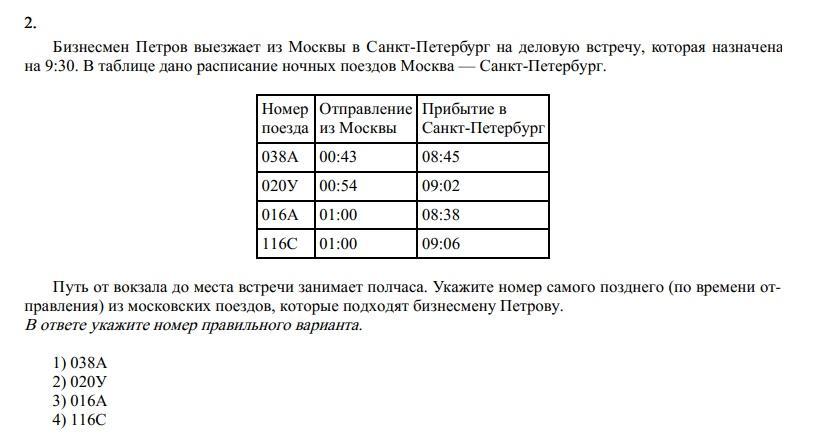 Путь от вокзала до места встречи занимает полчаса. Укажите номер самого позднего (по времени от‐