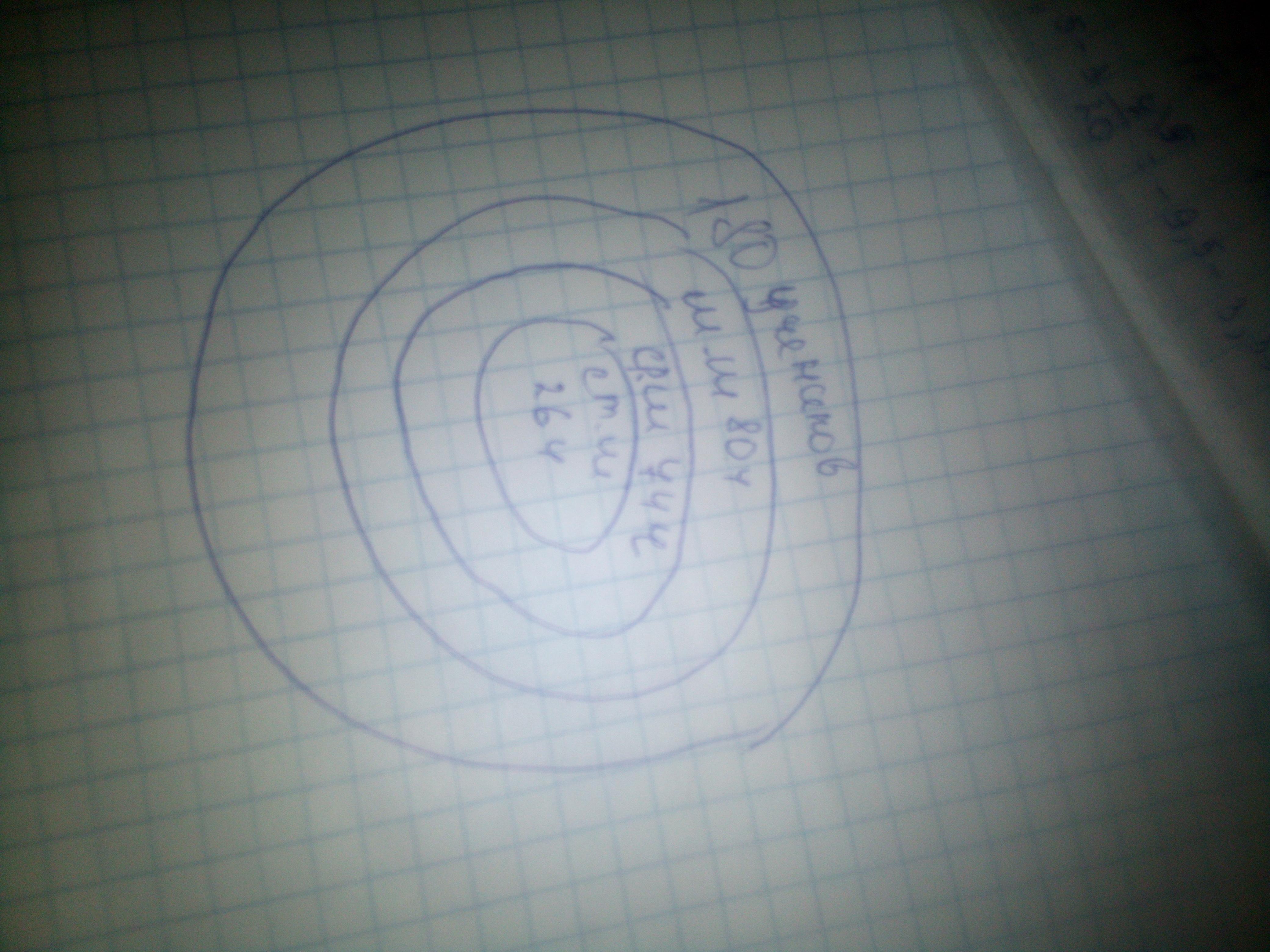В школе 180 учеников,младшая школа 80 человек, средняя школа 74 человека, старшая школа 26 человек. Составить круговую диаграмму