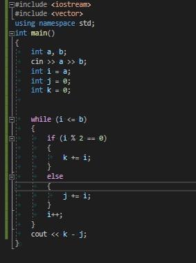 Программа получает на вход два целых положительных числа A и B, не превосходящие 2×10^9. Программа должна вывести одно число - разность между суммой четных чисел и суммой нечетных чисел от A до B.
